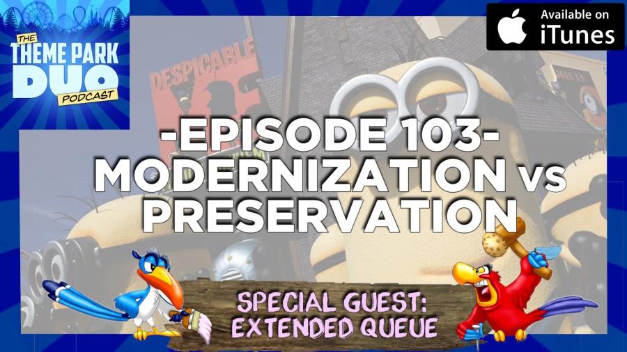 Sit down with Nikki and Gabriel as the hosts of The Theme Park Duo Podcast bring you an interesting conversation with Stephen and Tiffany of Extended Queue: A Theme Park Podcast all about modernization and preservation of theme park attractions. Remember The Enchanted Tiki Room: Under New Management? Do you like motion simulator attractions? These are just some of the attractions we cover in this episode, spanning all Theme Parks, including: Disneyland, Magic Kingdom, EPCOT , Universal Studios Hollywood, Universal Studios Florida, Islands of Adventure, and much much more. We also talk about Mystic Timbers at Kings Island, Invade at Busch Gardens Williamsburg, Knott’s Berry Farm Boysenberry Festival, Boomerangs closure, AT-AT spotting at Star Wars Land construction site and Race through New York with Jimmy Fallon. Its a fun packed episode so make sure to hold on tight.