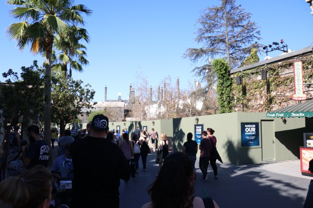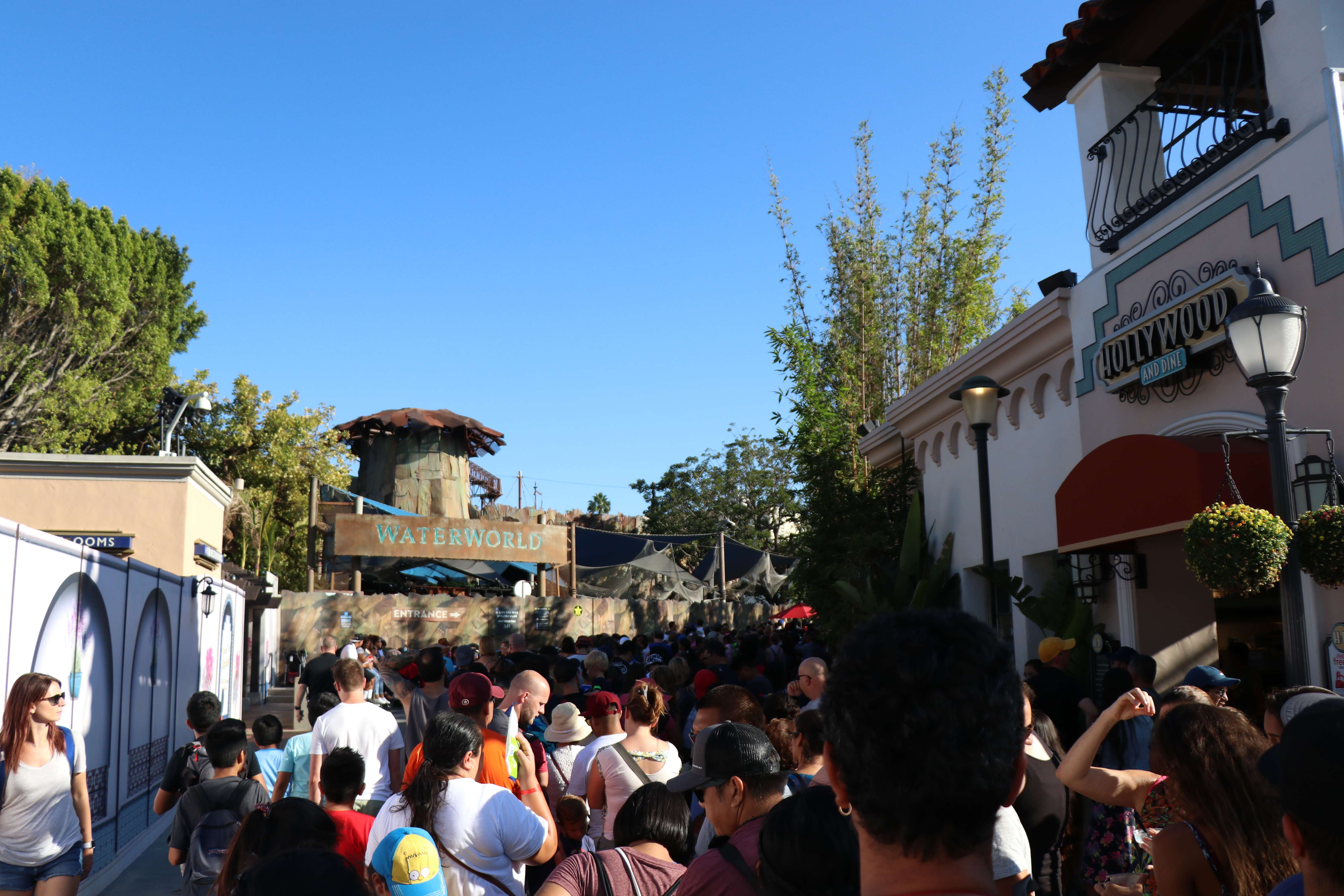 With the construction of Titans of Terror for Halloween Horror Nights in the main Waterworld Queue, the line goes to the right of the construction. Because it was not built for this, the area quickly becomes jammed with people waiting to get into Waterworld. Even though there are more construction walls with the new building going up not too far off, I can imagine that this will be a familiar sight during the HHN seasons.