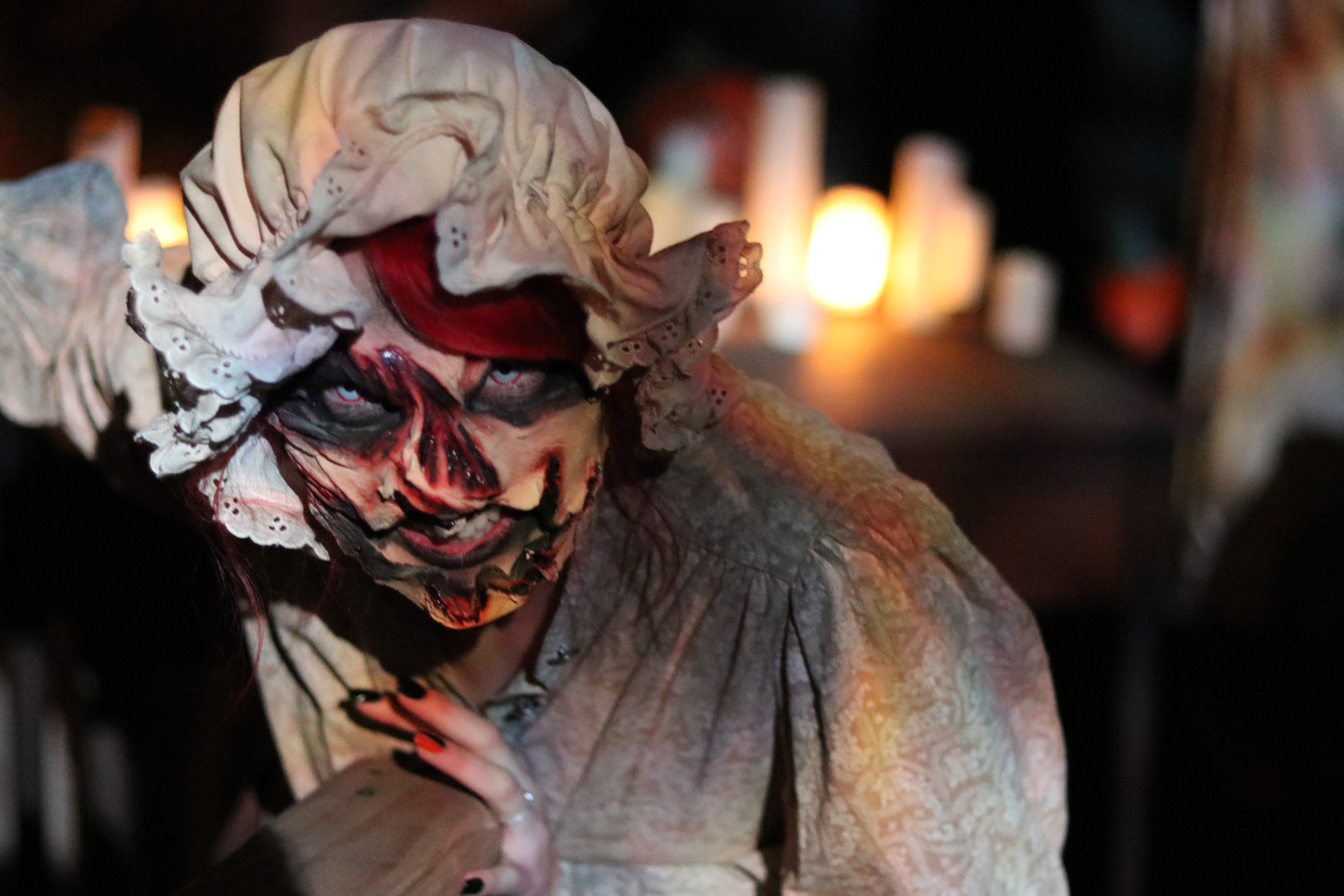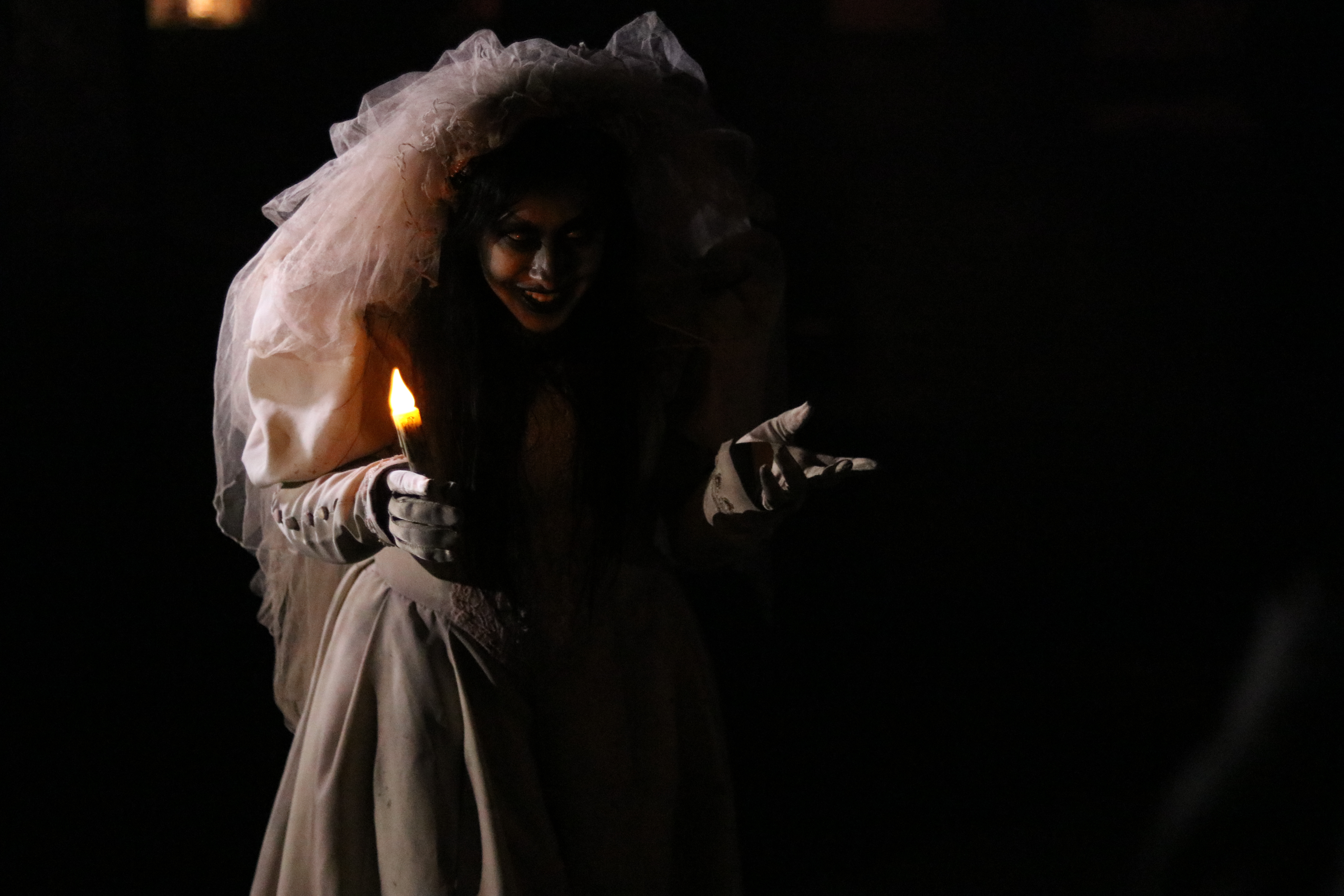 The Ghost Town Streets Bride beckons guests as they enter Ghost Town. Be warned, she is no Bride to be, but a Bride out to get you and your soul.