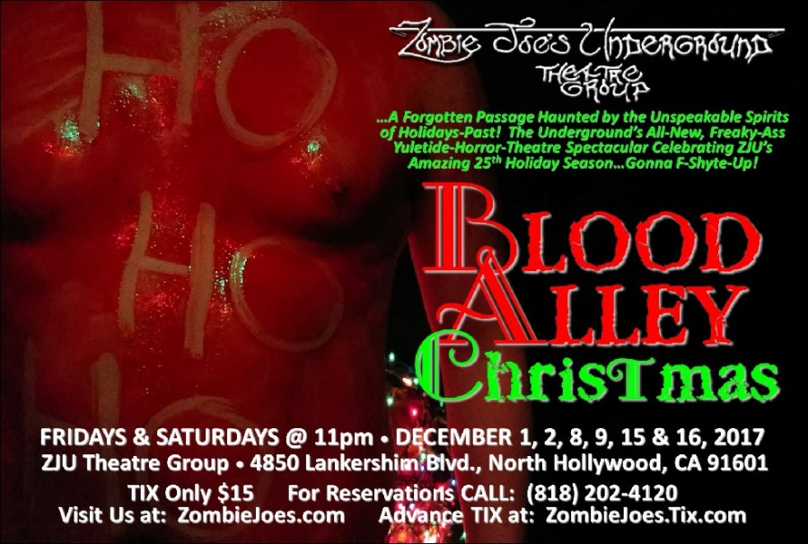 Zombie Joe’s Underground Theatre Group proudly presents their All-New 2017 Holiday-Horror-Theater Spectacular in the great Grand Guignol, Theatre of Cruelty and Butoh-Traditions, centering around the traumatic memoirs of a forgotten street-alley haunted by the longing, beauty and unspeakable yule-tide events of its cold, diabolical past; a cursed place of no mercy, inhabited by a hundred-year accumulation of apparitions, phantasms and seductive-sub-breeds that desperately await their next victim! Directed by Zombie Joe and Featuring: Patrick Beckstead, Jason Britt, Vanessa Cate, Michelle Danyn, Shayne Eastin, Ian Heath, Makoa Kawabata, Amanda McKenna, Elif Savas, Brandon Slezak and Matthew Vorce; Live Musical Score by Kevin Van Cott; For Ages 16 and up.