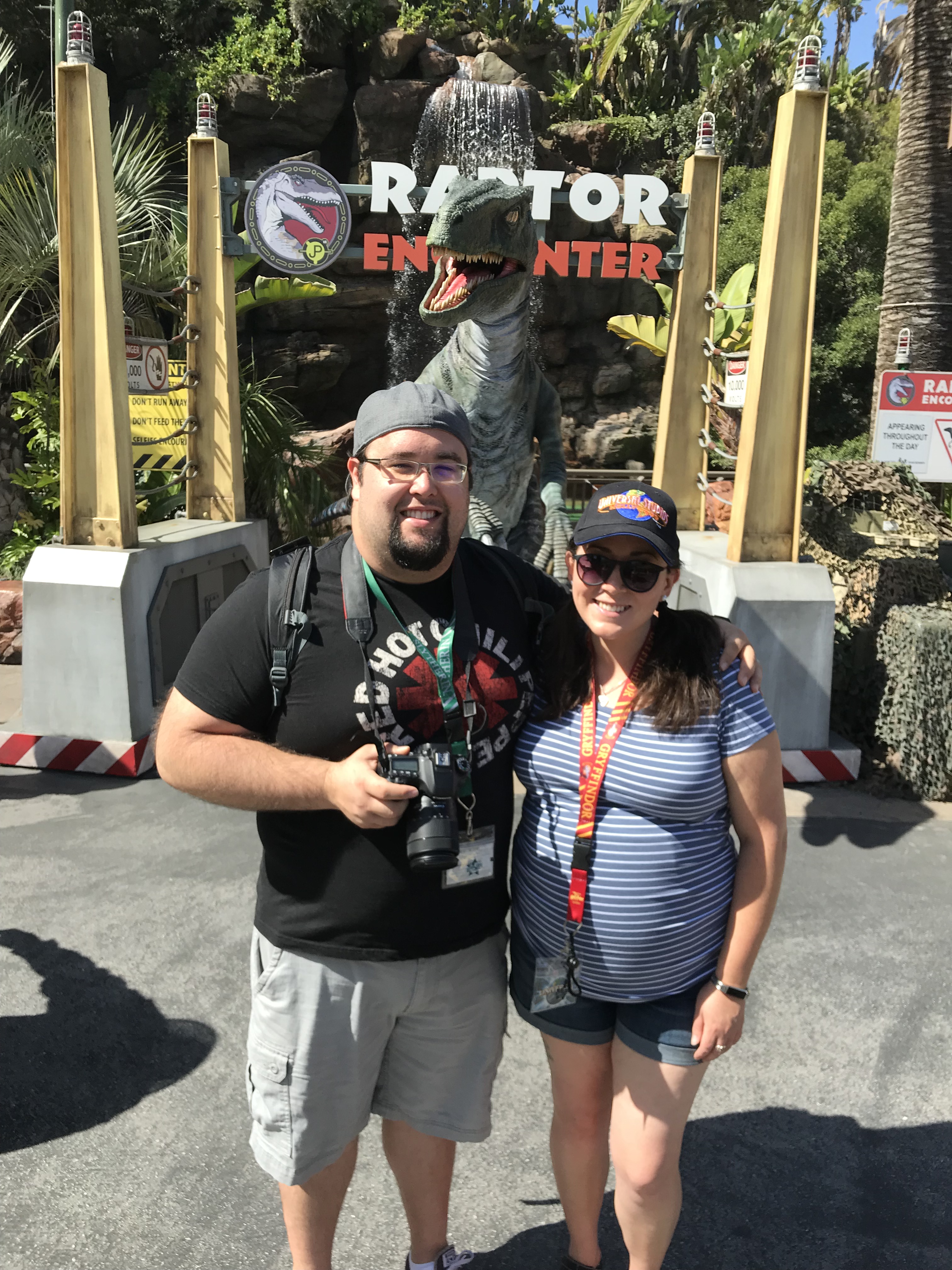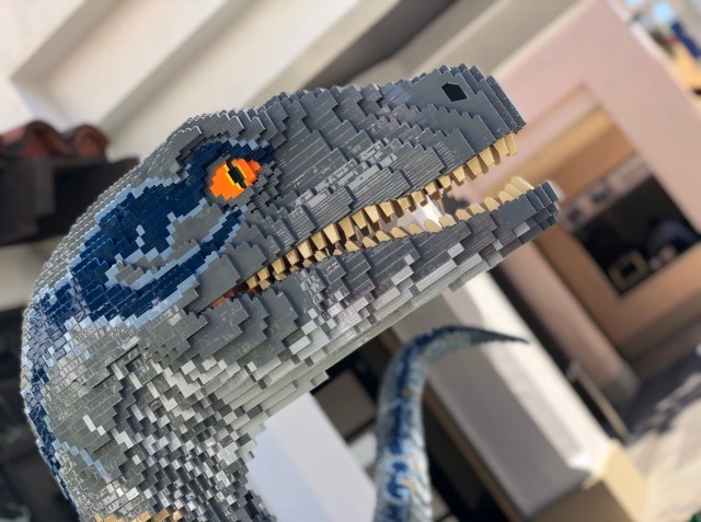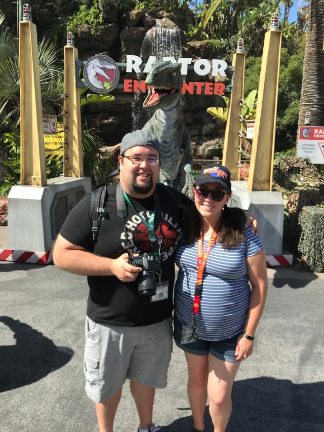 On our last trip to Universal Studios Hollywood, we were making our way down to the Lower Lot to see some of the progression of Halloween Horror Nights Mazes as well as a possible goodbye ride on Jurassic Park. As we approached the bottom of the escalators, we noticed that the Raptor was already out for the Raptor Encounter! Us being dorks for photo ops, we went directly over for a face to face encounter. But this was no regular Velociraptor, it was BLUE! We were so jazzed to see Dino that we recognized from the Jurassic World film.