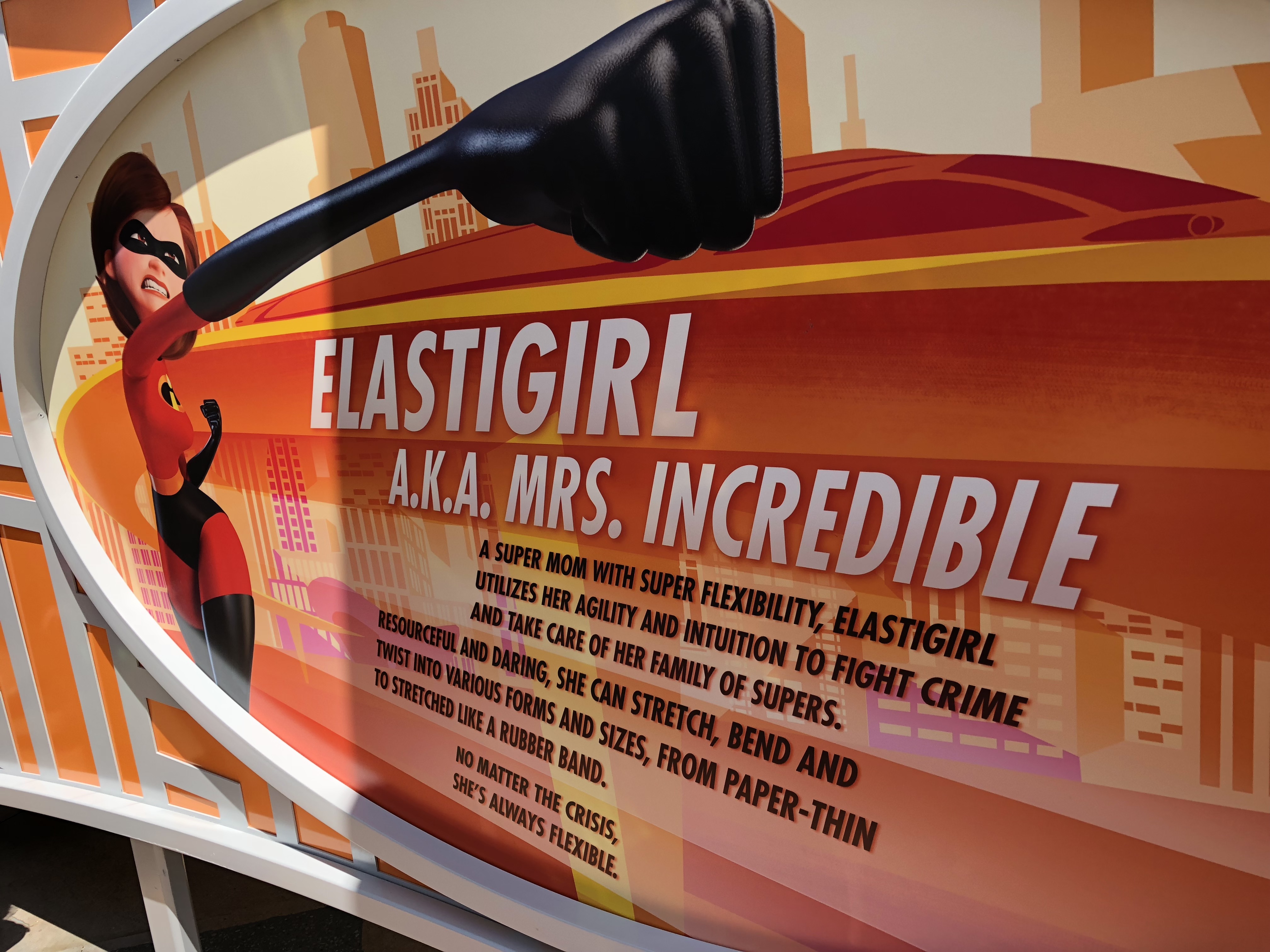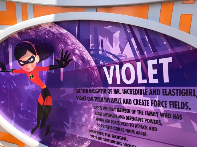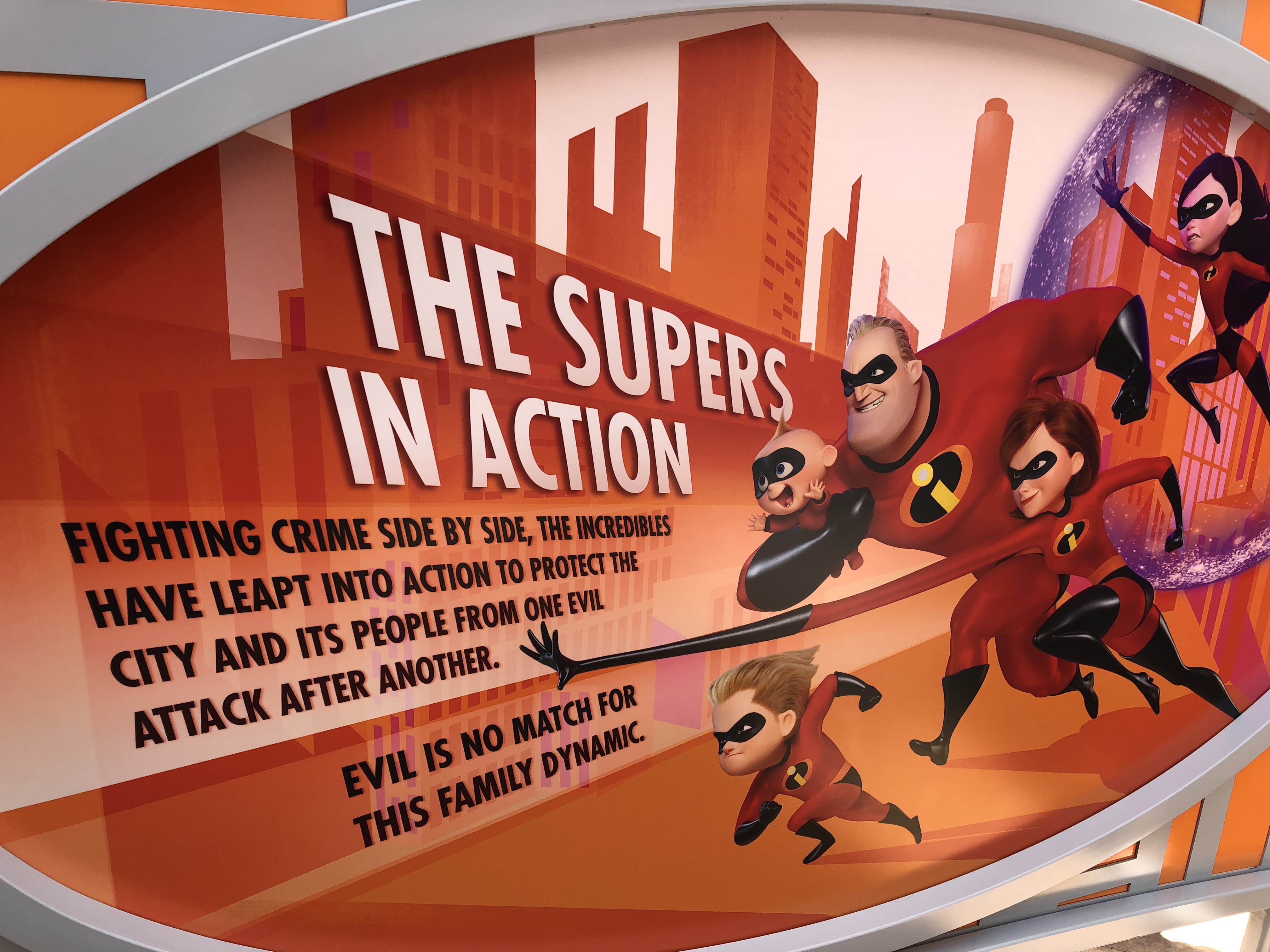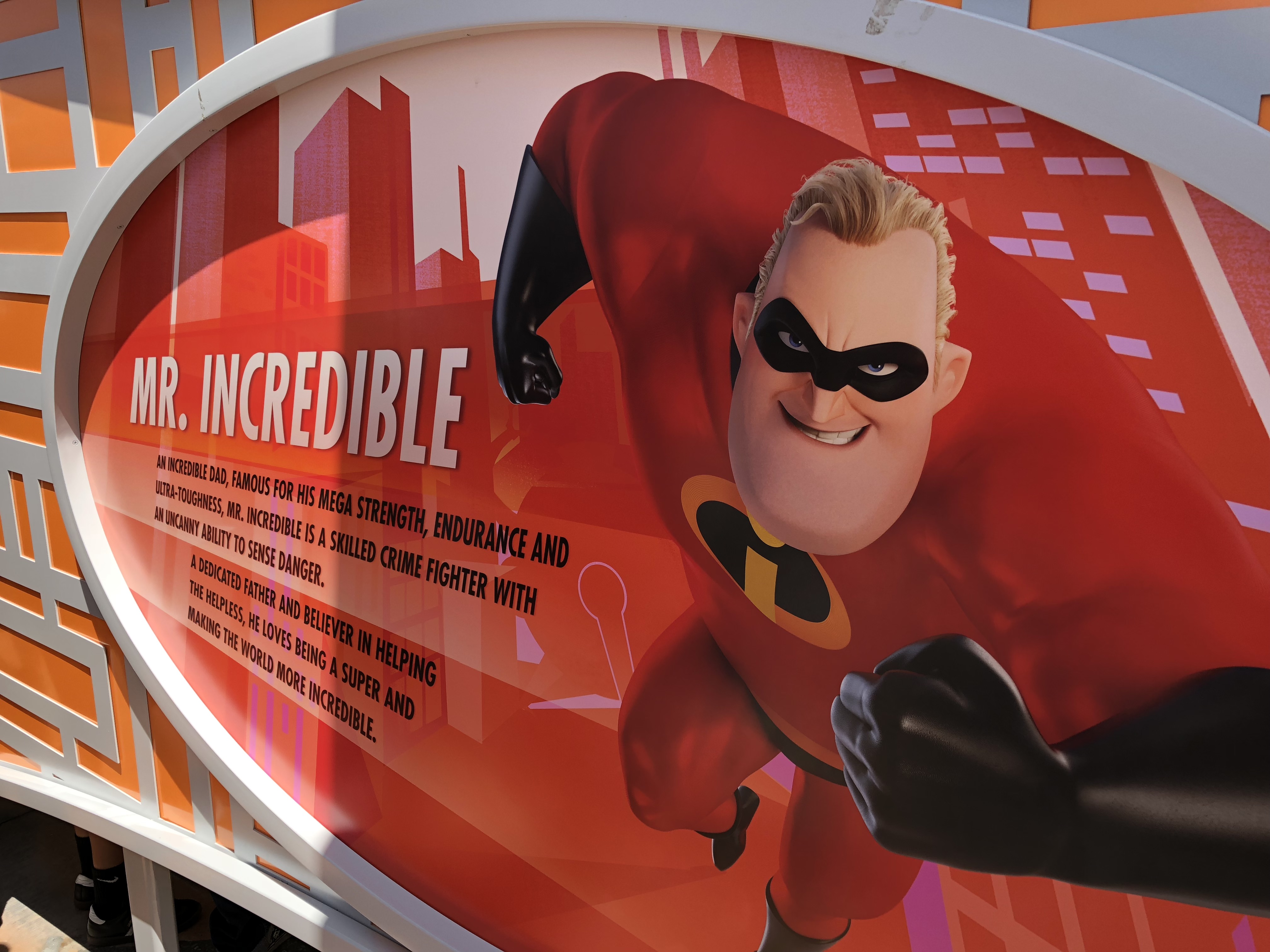 The entrance is grand, and I actually really love the artwork that adorns the underside of the entrance archway. Which leads me to the EXTREMELY underwhelming sign for the attraction itself. For a ride based off of superheroes, this sign feels extremely un-super.