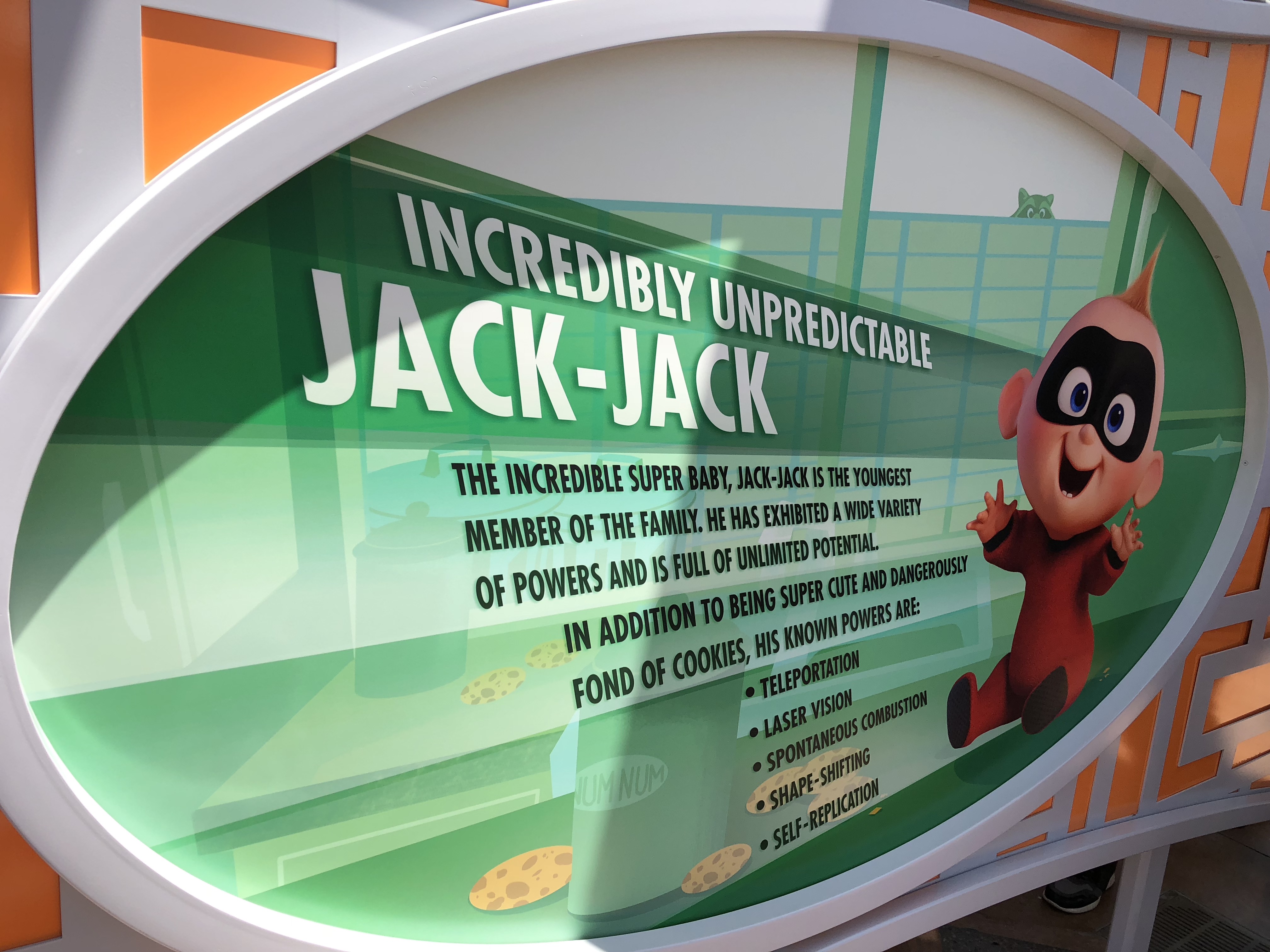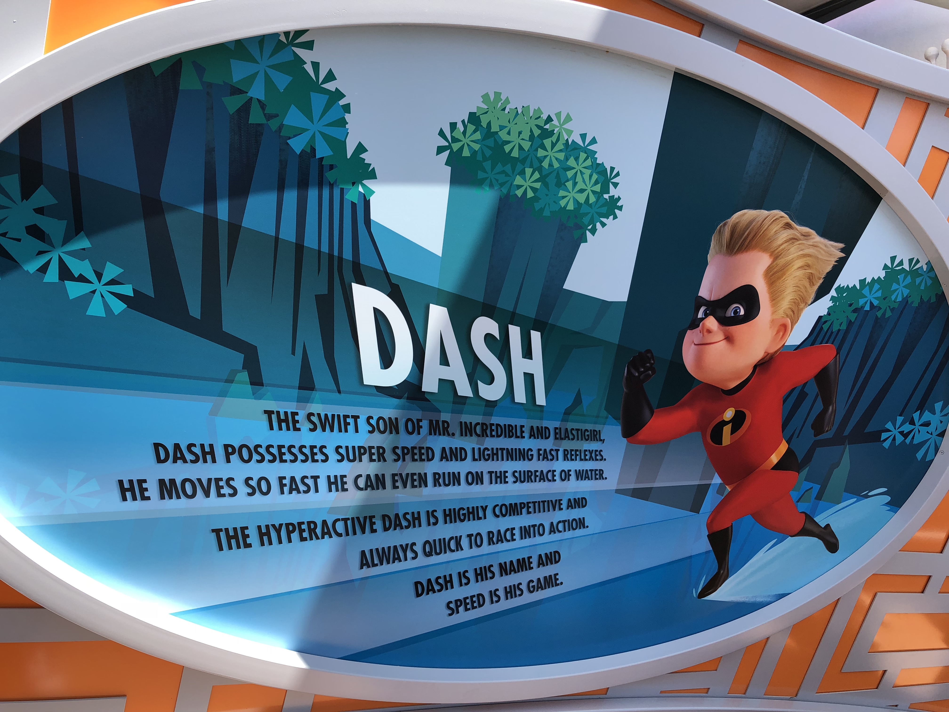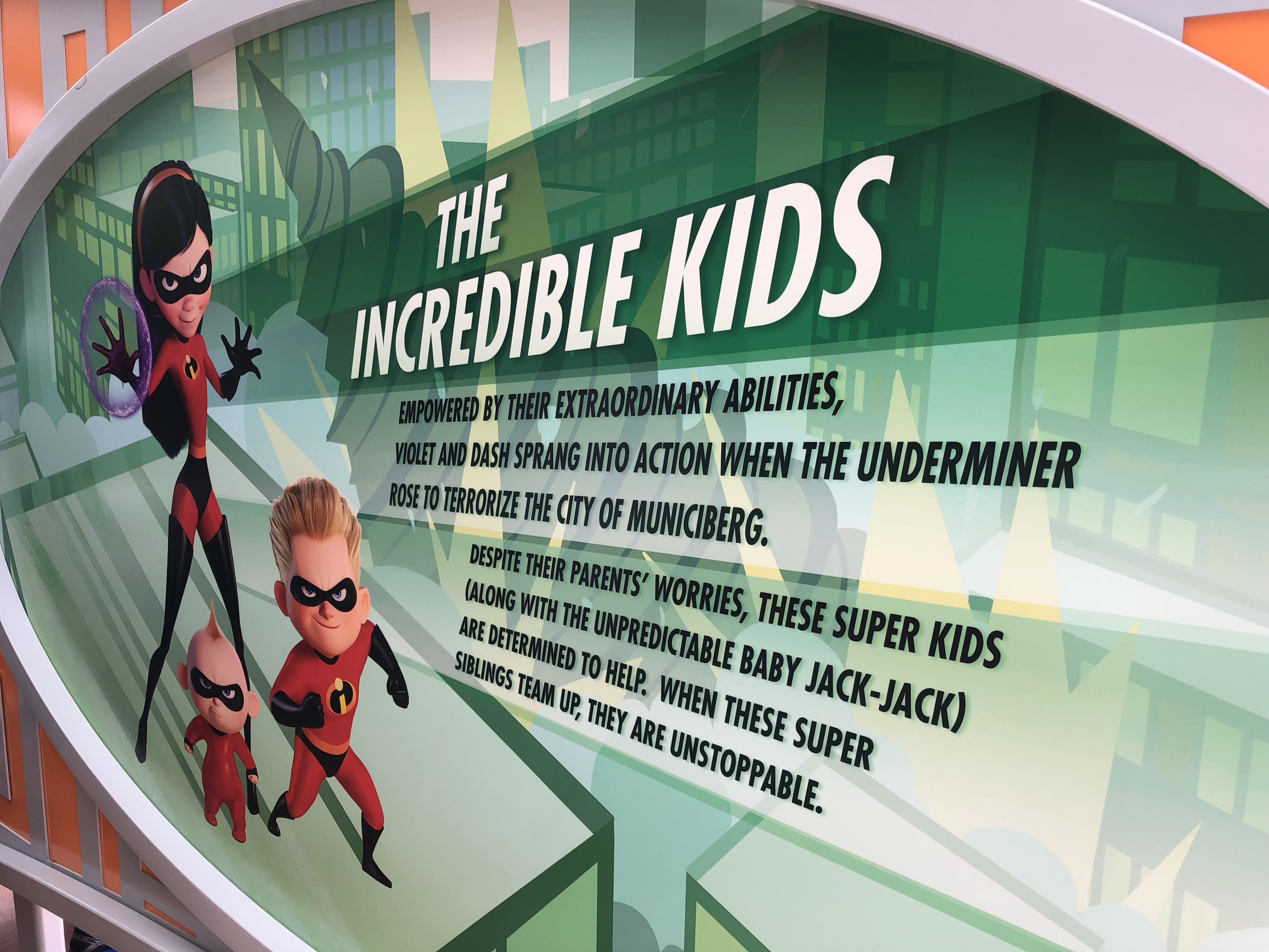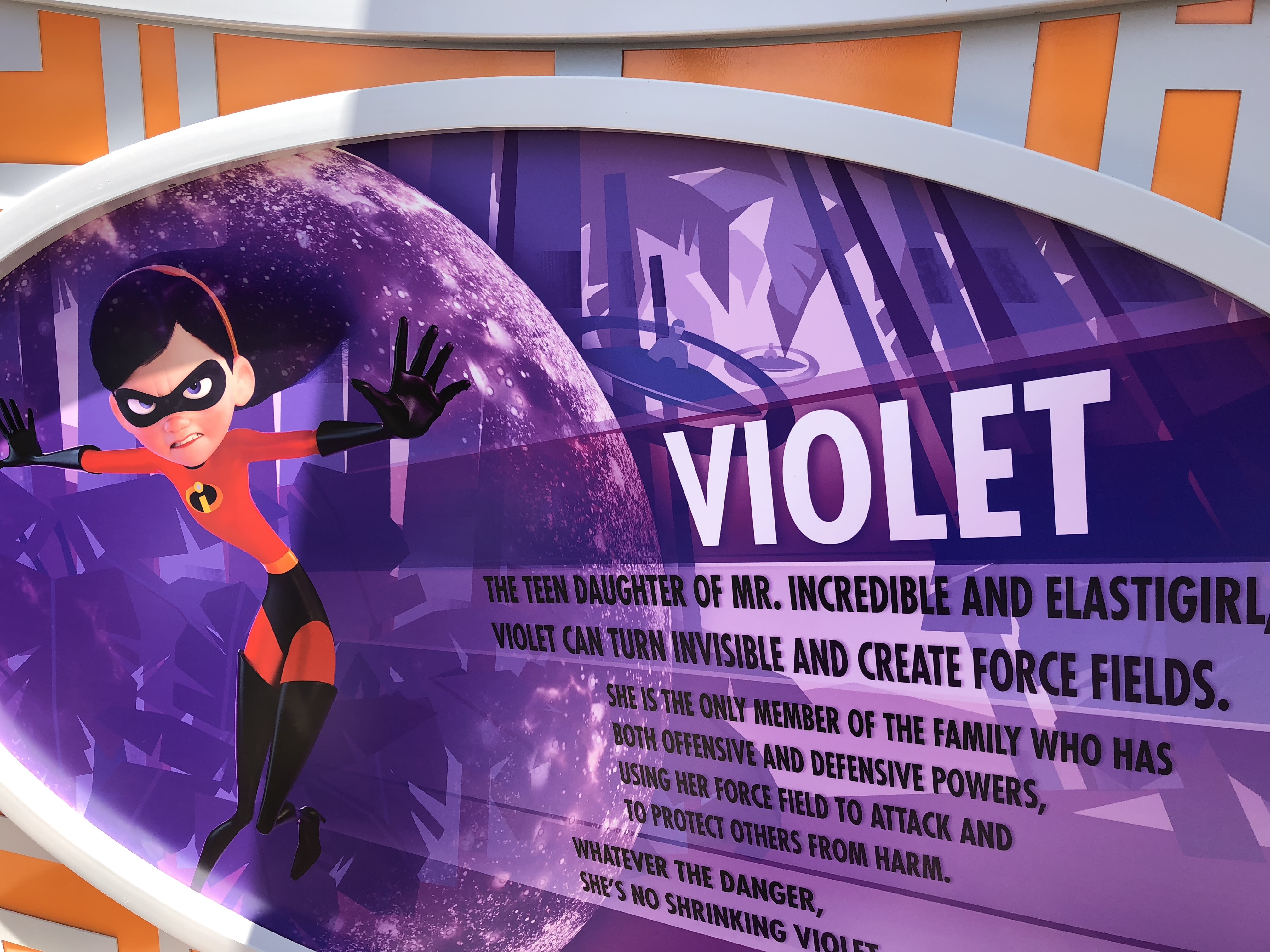 The entrance is grand, and I actually really love the artwork that adorns the underside of the entrance archway. Which leads me to the EXTREMELY underwhelming sign for the attraction itself. For a ride based off of superheroes, this sign feels extremely un-super.
