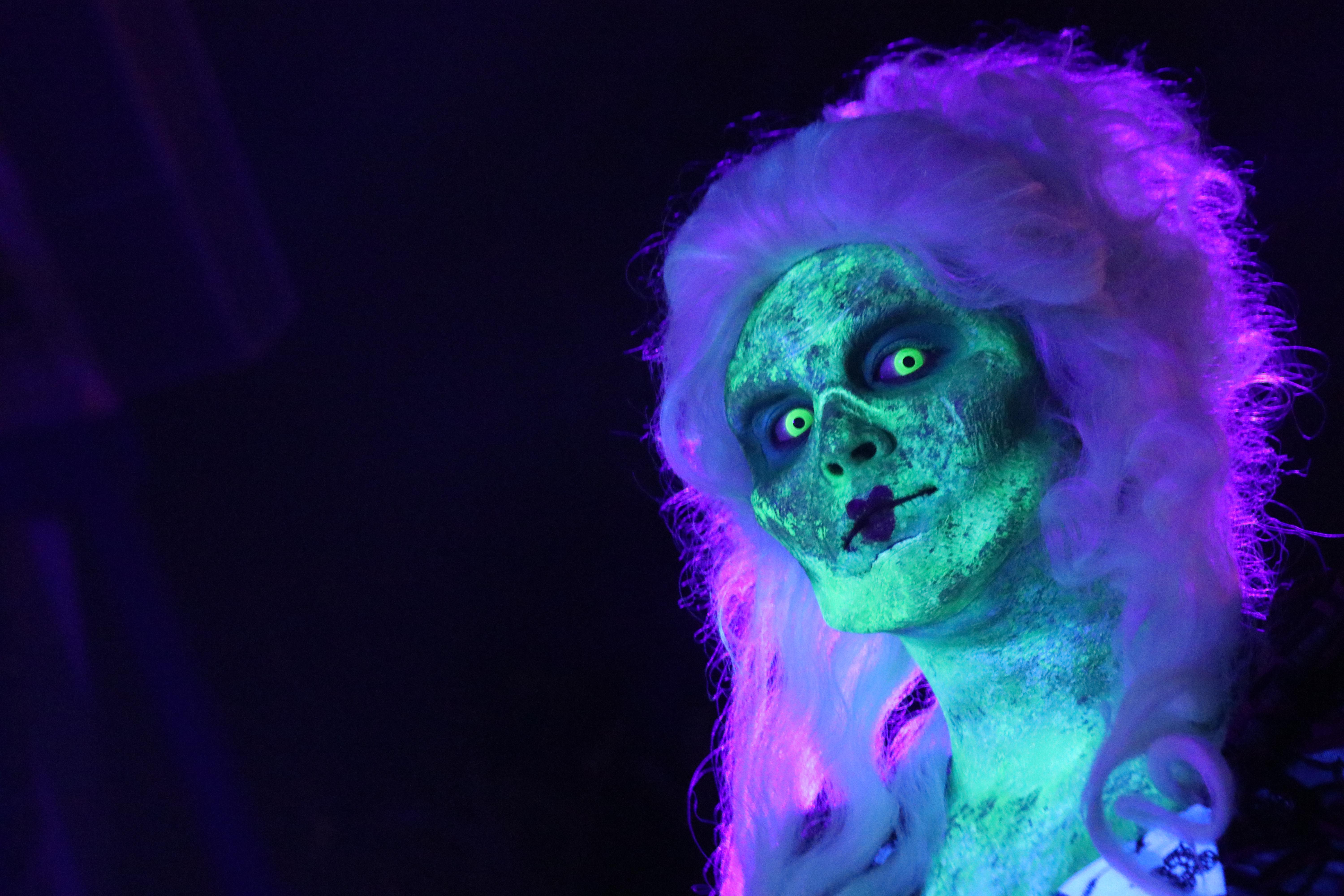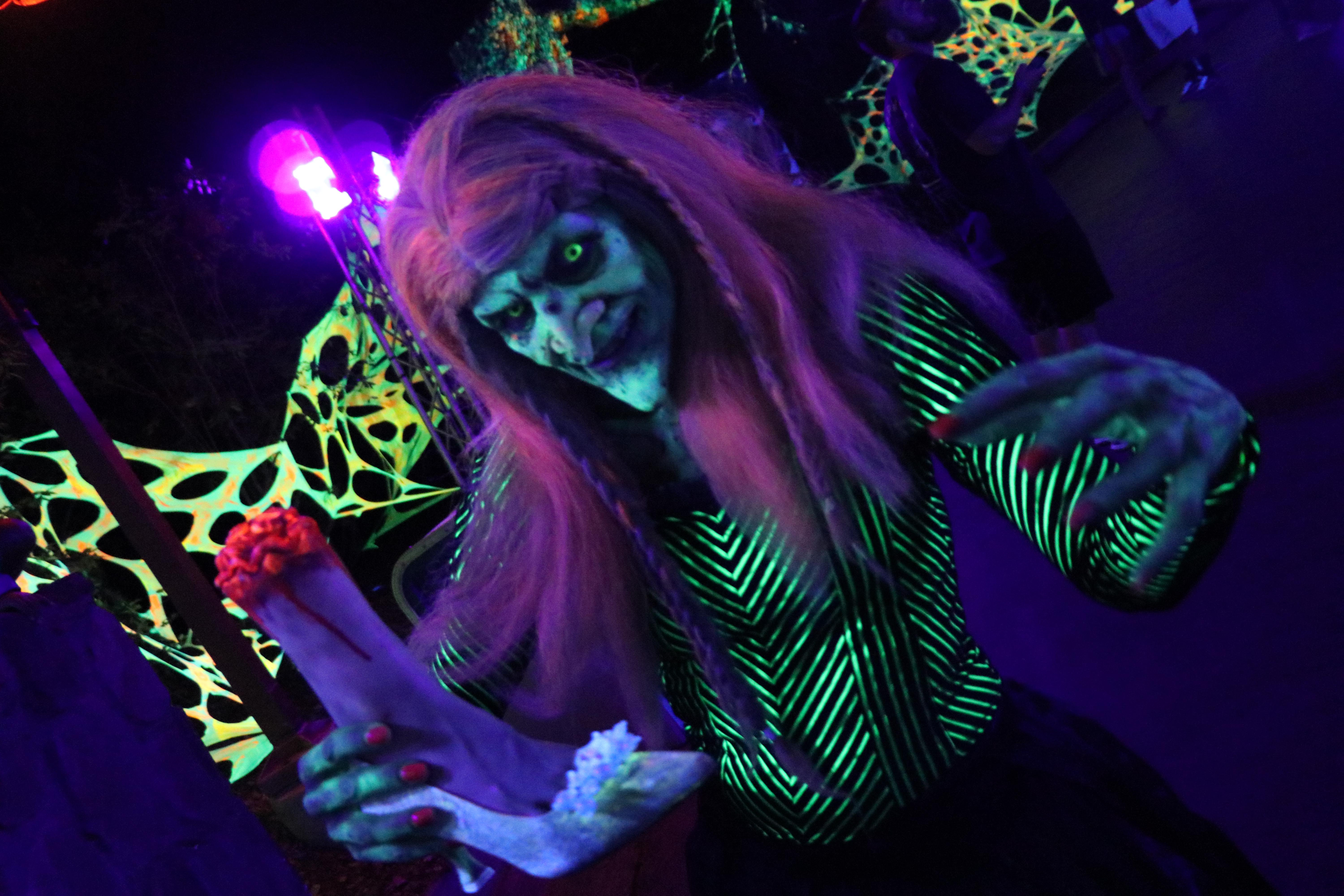 The bright glowing greens, yellows, oranges and whites are eye popping and a great addition to an over all dark area. What I love most is that a lot of the characters have contacts that allow their eyes to glow in the black light as well. There is something so unnerving and unnatural about coming face to face with monsters with glowing eyes. It really adds another level to this area.