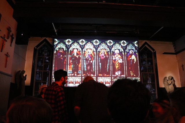 Enough with the bad and let’s talk about the attraction. When you enter the Church, the inside is decorated like…a church! We were very impressed with how detailed the interior of the building was designed and were pumped to see what was in store for us!
