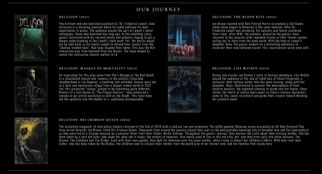 “Using an innovative blend of suspenseful storytelling, a chilling original score, creature FX, and professional actors and stuntmen, Delusion creates a truly one of a kind world-class immersive experience. You will interact with actors, perform actions, retrieve objects, solve mysteries, choose paths and perhaps sacrifice yourself to move the story forward.”