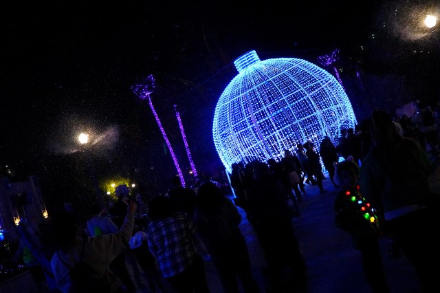 One of the newest additions to Holiday in the Park is Merry Lane! This is right in front of the Hall of Justice. Massive round ornaments, made of string lights, flash and change with the holiday music.