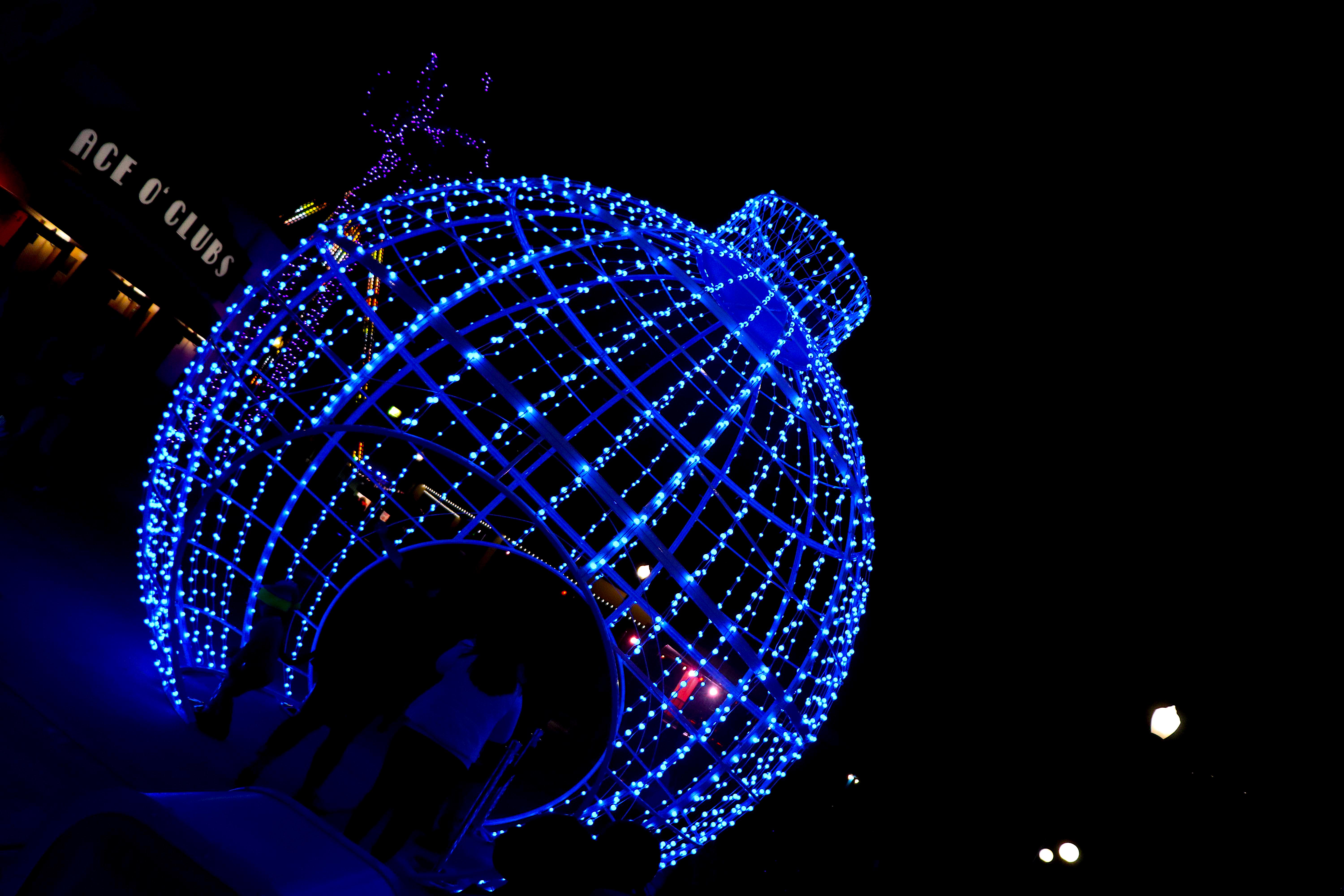 One of the newest additions to Holiday in the Park is Merry Lane! This is right in front of the Hall of Justice. Massive round ornaments, made of string lights, flash and change with the holiday music.