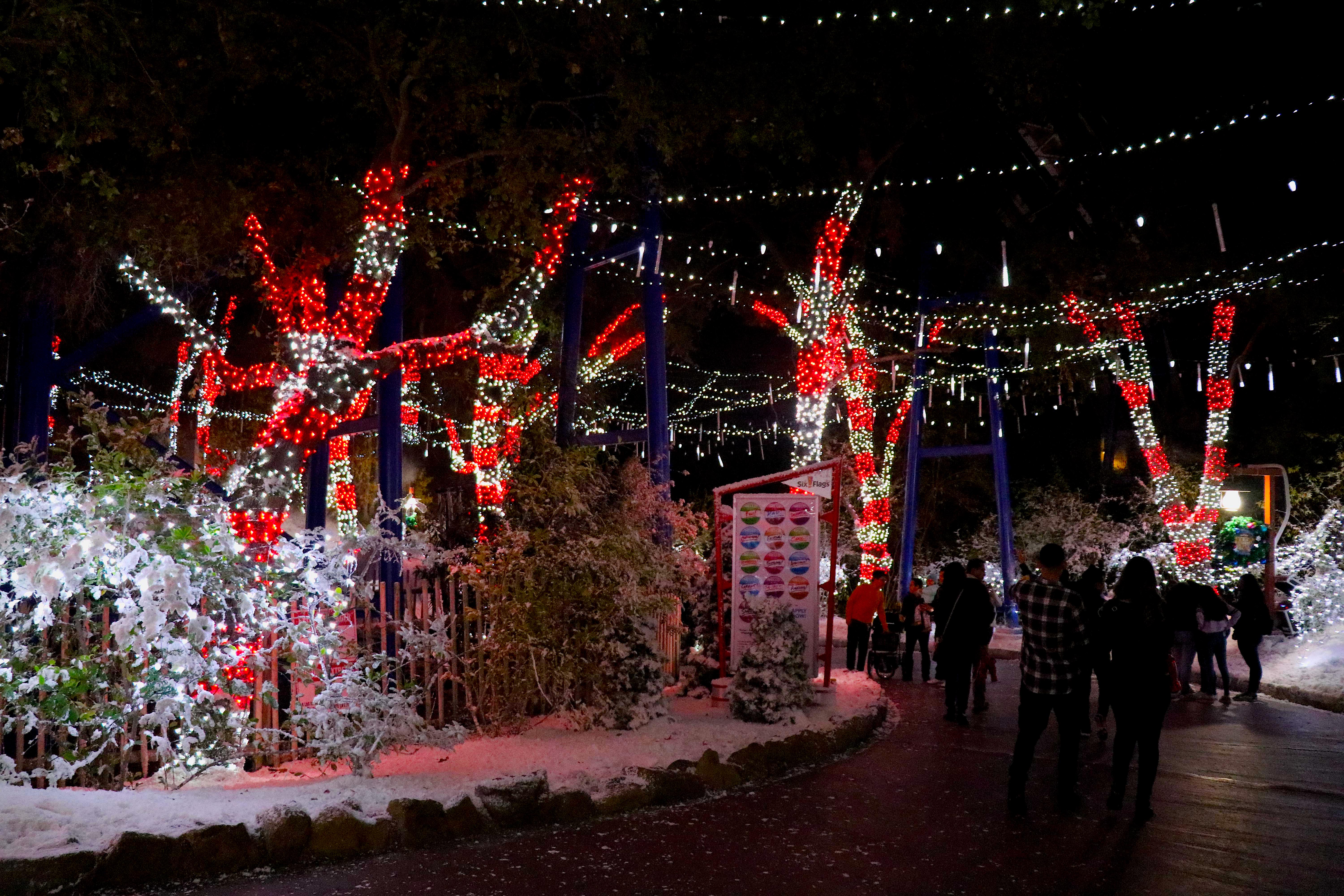 As soon as you enter the park, the area named Holiday Square, the difference between SFMM and its competitors is apparent. While most parks take a more simplistic and tradition take on holiday decorations, SFMM takes it in a fantastical direction, while still maintaining a familiar tone. You will find colored lights everywhere! Around the trees, around bushes, planters, light poles and anything you can think of. The whole entrance of the park perfectly sets the stage for the the rest of the event.