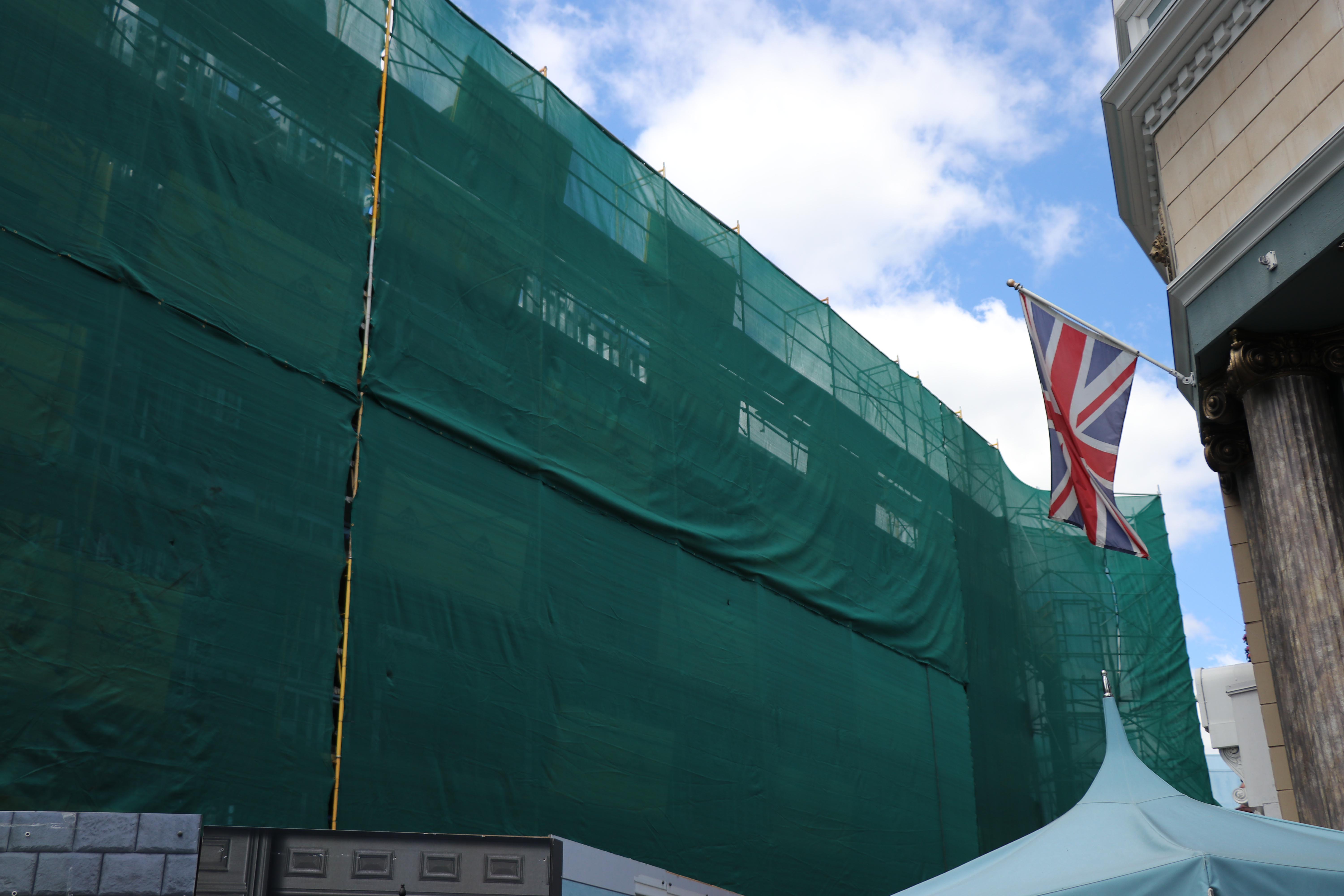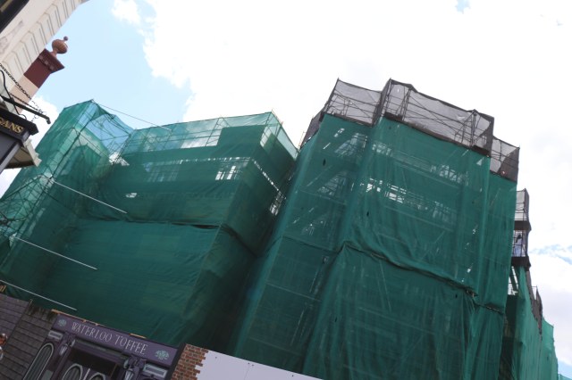 If you look close enough through the scaffolding, you can start to see the facade take shape. Small rectangular openings, soon to be windows, line the facade from top to bottom.
