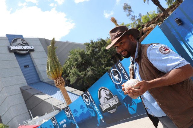 In front of the construction walls, Universal has placed a TM holding a dinosaur egg for guests to hold in a photo.