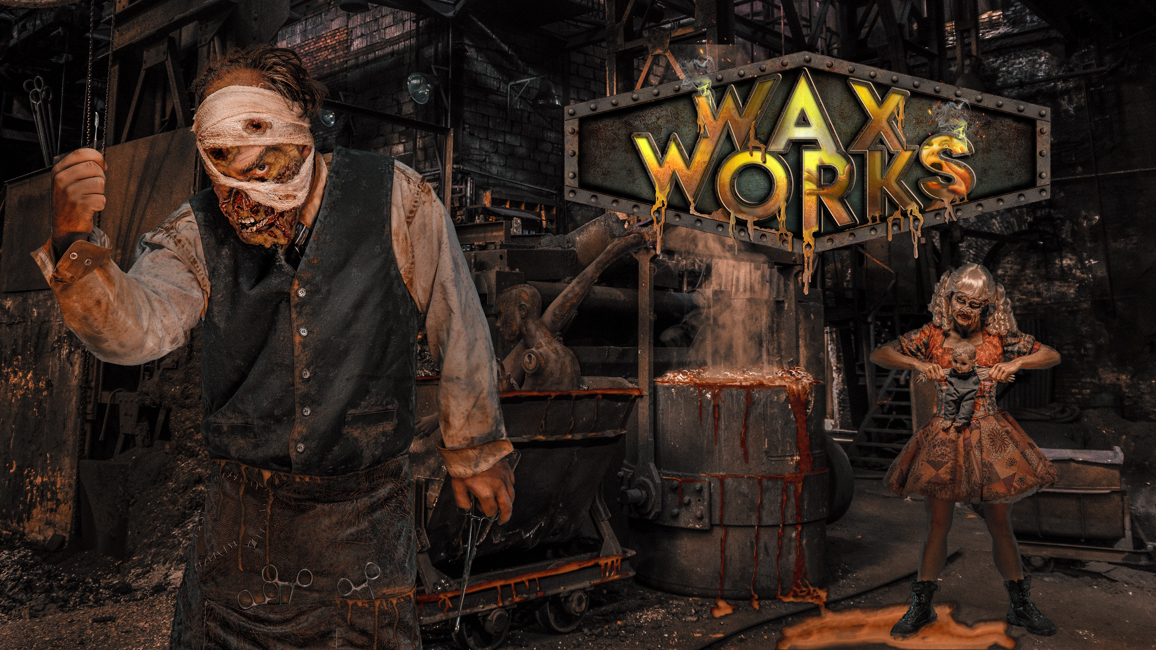 Wax Works (New for 2019) – Mysterious lights and strange noises have begun to emanate from the eerie abandoned wax museum. The once prominent plastic surgeon, Dr. Augustus Scratch, has been seen tinkering at night and is now ready to show off his beautiful yet terrifying life-like masterpieces of hot molten wax and bloody flesh. It’s rumored that blood-curdling screams can be heard echoing through the halls of Wax Works as victims are horrifyingly submerged into a scorching hot cauldron of bubbling wax. Take a closer look at his gruesome works of art and try to escape his deadly grip or become the newest masterpiece in his collection.