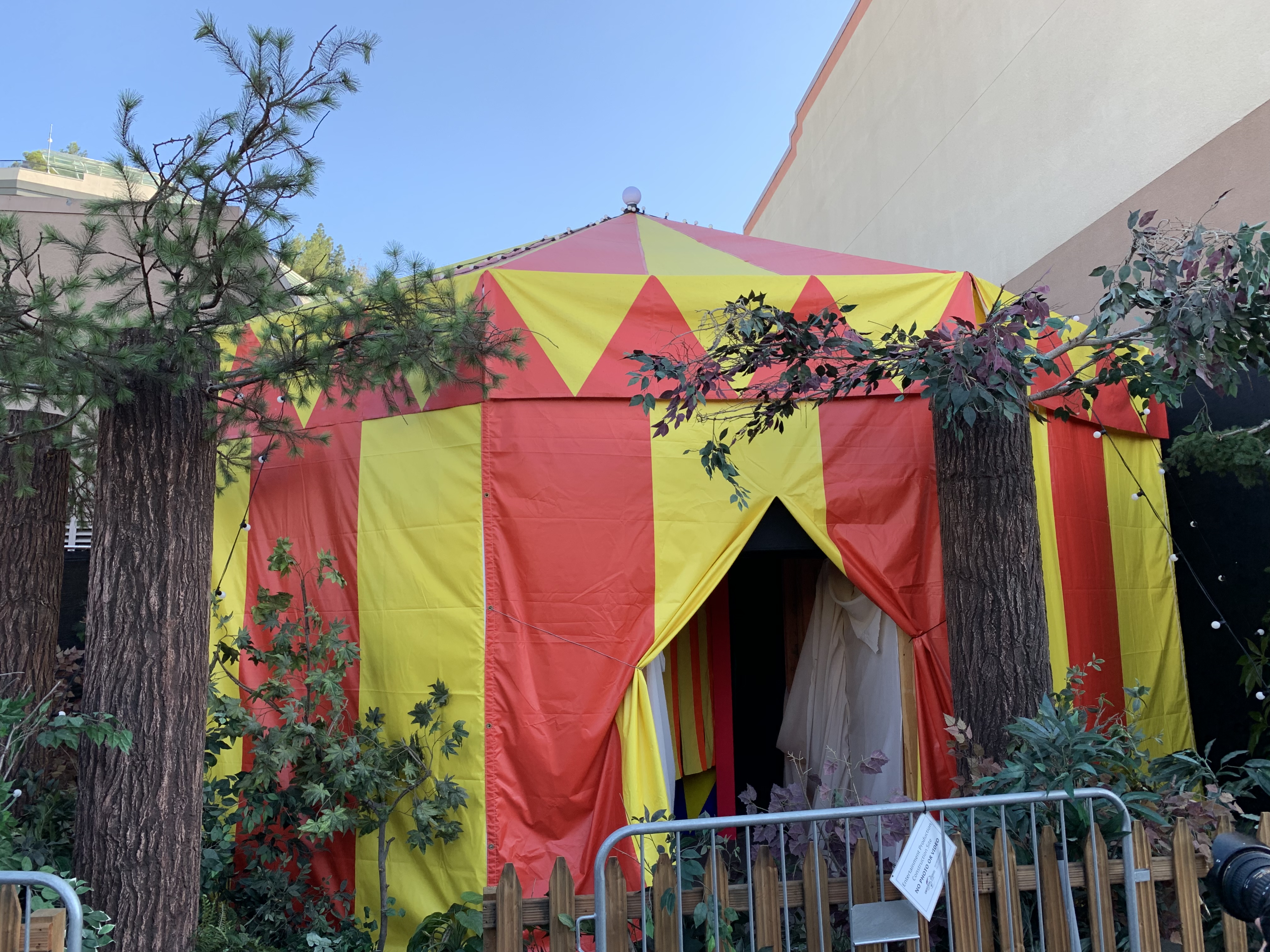 Our first stop was Killer Klowns located in the overflow queue for Revenge of the Mummy: The Ride. A lot of this maze was still in the construction phase, so we unfortunately didn’t get to see as much as we would have enjoyed. However, we could certainly tell that the wacky and zany spirit of the film certainly comes through. From our interpretation, it appears as though guests to the event can expect to make their way through the plot line of the cult classic 80s film with plenty of room for cotton candy and popcorn themed scares. The facade begins with the iconic circus tent in the woods and a performer playing Farmer Gene. Guests are transported via disorienting neon hallways onto the bizarre Klown themed space ship.
