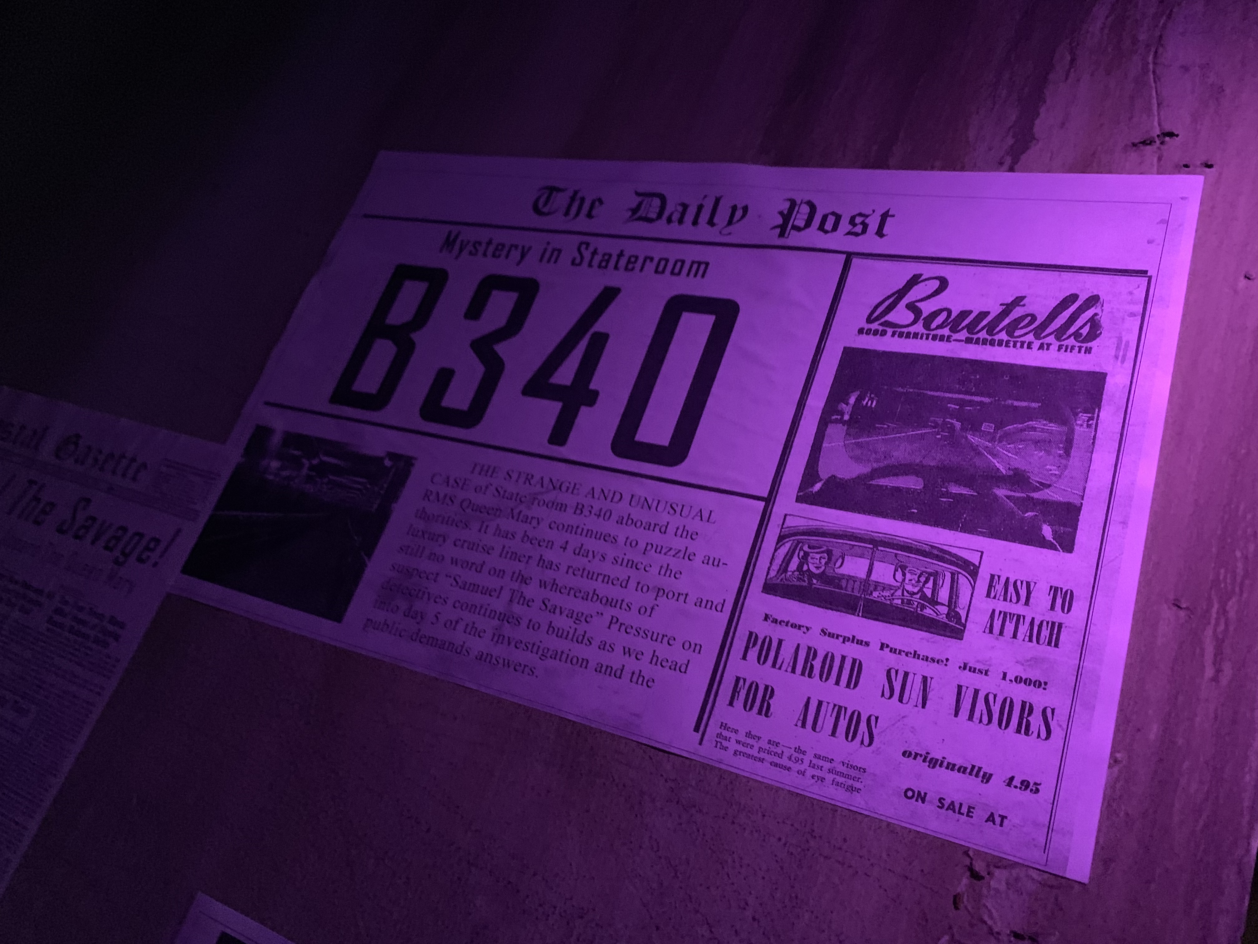 Everything you have heard about B340 is true. Follow the lead detective on the scene as he uncovers the sinister truth behind one of the most notorious criminals to ever invade the luxury liner. According to ship and police reports during a cross-Atlantic voyage in October of 1948, passenger Samuel was deranged and dangerous and went on a bloody rampage against passengers and staff before being captured and locked in Stateroom B340, only to vanish. When police entered the room, the blood-soaked walls, cruel carvings, and no sign of Samuel launched a mystery that to this day remains unsolved. You don’t want to be the person who finds him.