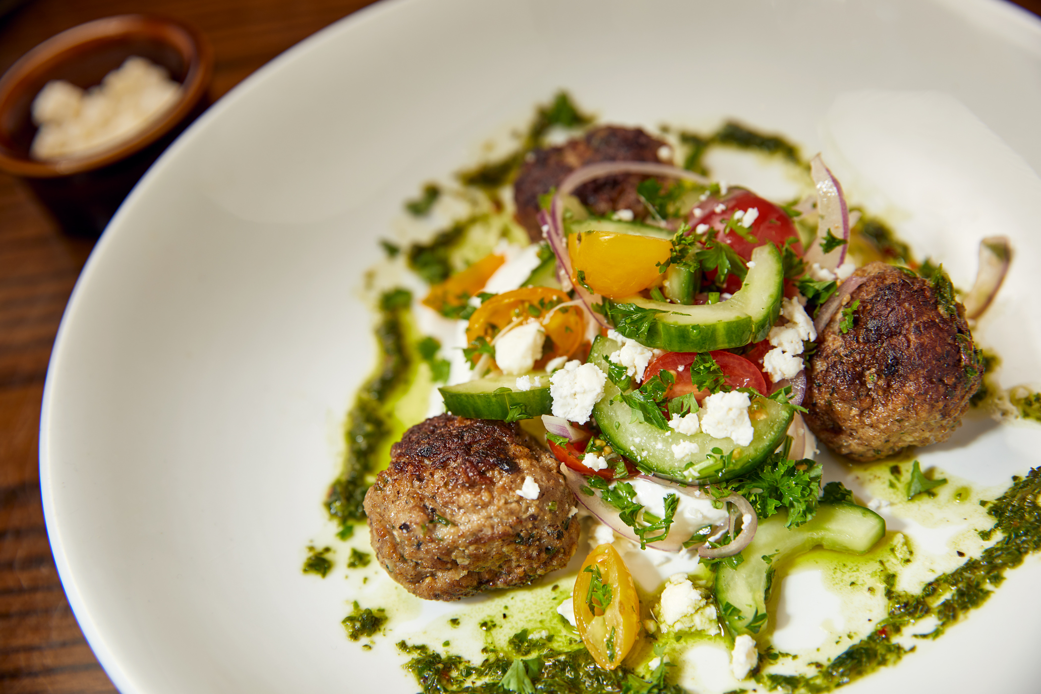 - Grilled Lamb Meatballs: Grilled spiced lamb meatballs with tzatziki sauce, tomato-cucumber relish, feta cheese and mint chimichurri