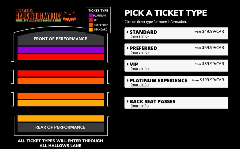 There are four types of tickets you can purchase for the event. Obviously, the more expensive you go, the closer you’ll be to the front of the event. The most expensive ticket would be the Platinum Experience at $199.99 a car (with up to 8 guests). The next would be VIP at $89.99 a car (with up to 2 guests in the car), then Preferred at $69.99 a car (with up to 2 guests in the car), and Standard for $49.99 a car (with up to 2 guests in the car). The Platinum Experience is the only ticket option that doesn’t require a Back Seat Pass for extra guests. And in fact, the Platinum Experience is arguably the best bang for your buck if you’re coming with lots of friends. If you have a group of 8 friends attending, that comes out to be about $25 a person. Which, with the added perk of being exposed in the hay wagons and having a much more traditional Haunt experience; is tremendous value.