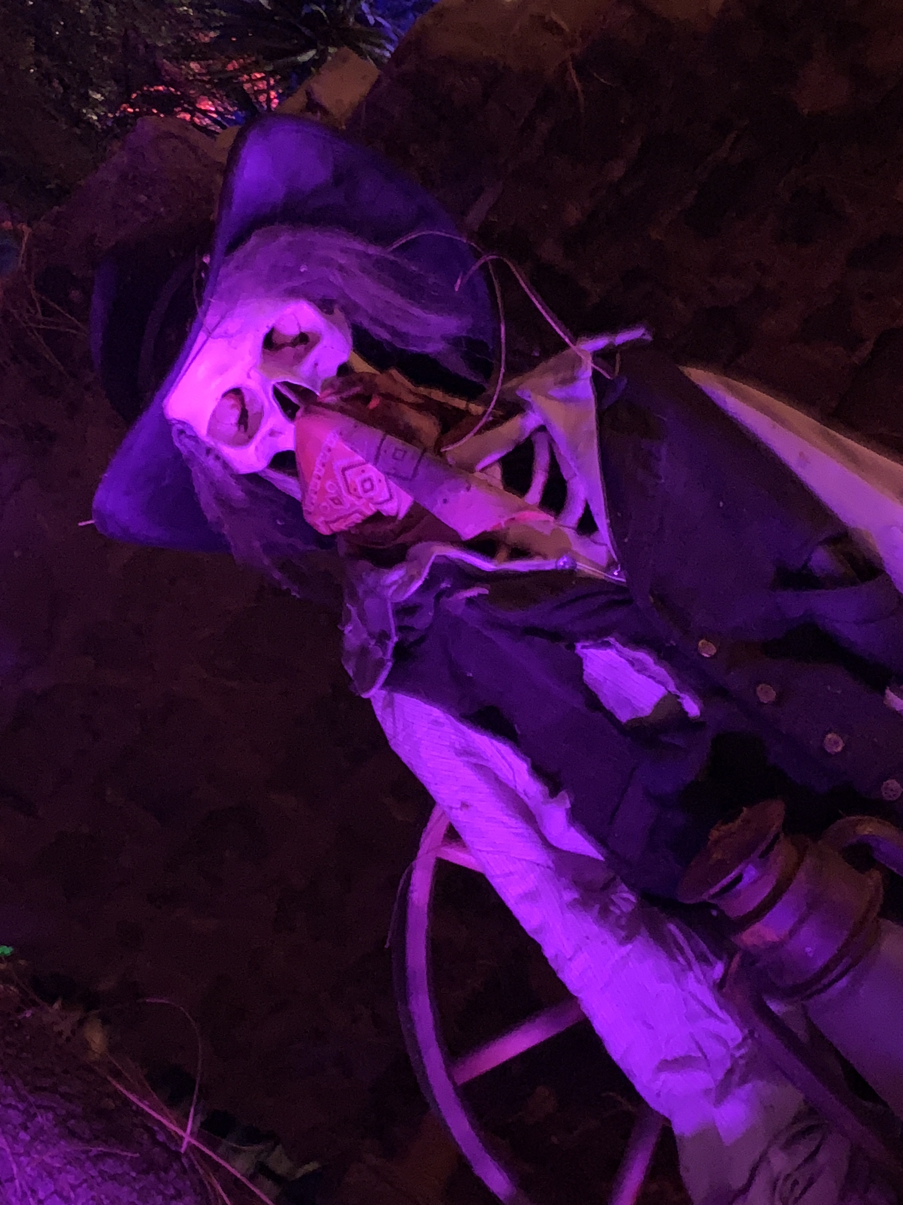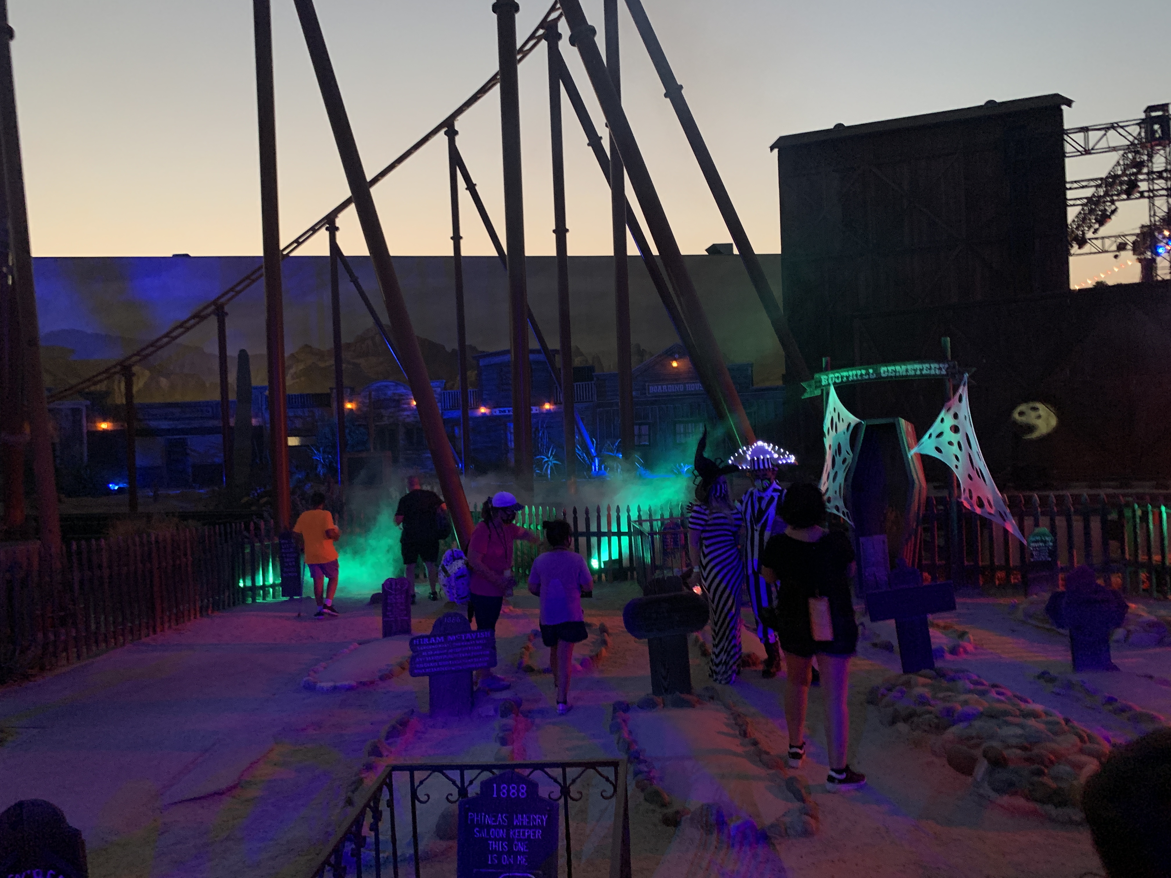 Imagine the vibes of Scary Farm, but without the monsters. But we did see a few people get scared by some of the friendly ghouls, still around Calico. Which of course, got us to laugh pretty hard.
