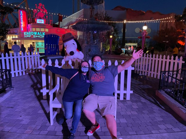 As the opening ceremony ended, we headed straight to Ghostrider to get one good coaster in that night. In fact, it was Nikki’s first coaster since the beginning of the pandemic. Then we headed over to Bear-y Tales to get in our very first ride. Of course our brisk walk over to the ride was stopped by a great photo op with Snoopy!