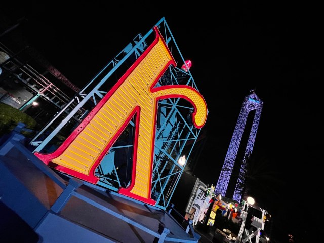 With the rest of our night, we took in the sights and sounds of the Farm. There were some really fun photo ops set up throughout the park celebrating rides from the past. And even the massive K from atop the Sky Tower. This K was recently replaced with a K with LED lights and it is magical. But being able to see this iconic K up close was almost emotional. For many people, it was a beacon letting people know they were so close to the park. For us, growing up in SoCal it was the landmark we always looked for.