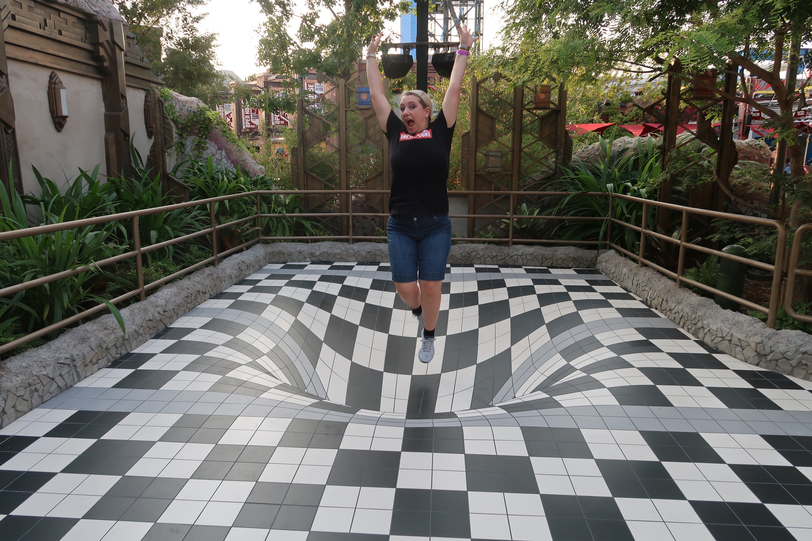 Across the way, we caught a glimpse of Captain America chilling near the plane and waving to his fans. Just adjacent to Captain America is an Ancient Sanctum, where Doctor Strange tells the secrets of this area. We learned there was to be one show only at 8:45pm, so we would return to learn what we could about this magical place. There is an optical illusion area that is well worth spending some time to stand in the right place and snap a photo. Pretty cool! Thank goodness the sun had already begun it’s descent. This area tends to be a very warm place to be in during the day with all of the buildings and concrete. We headed out of the Avengers Campus to find some grub.
