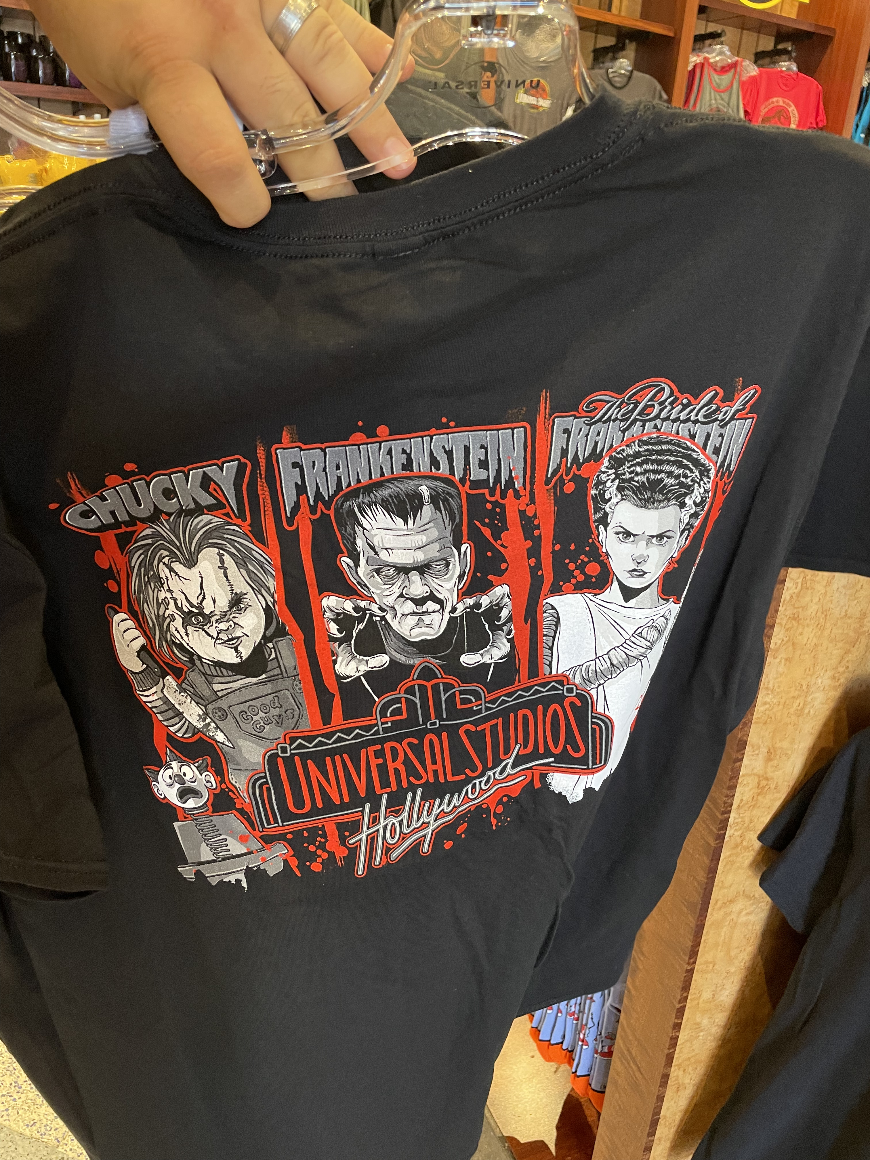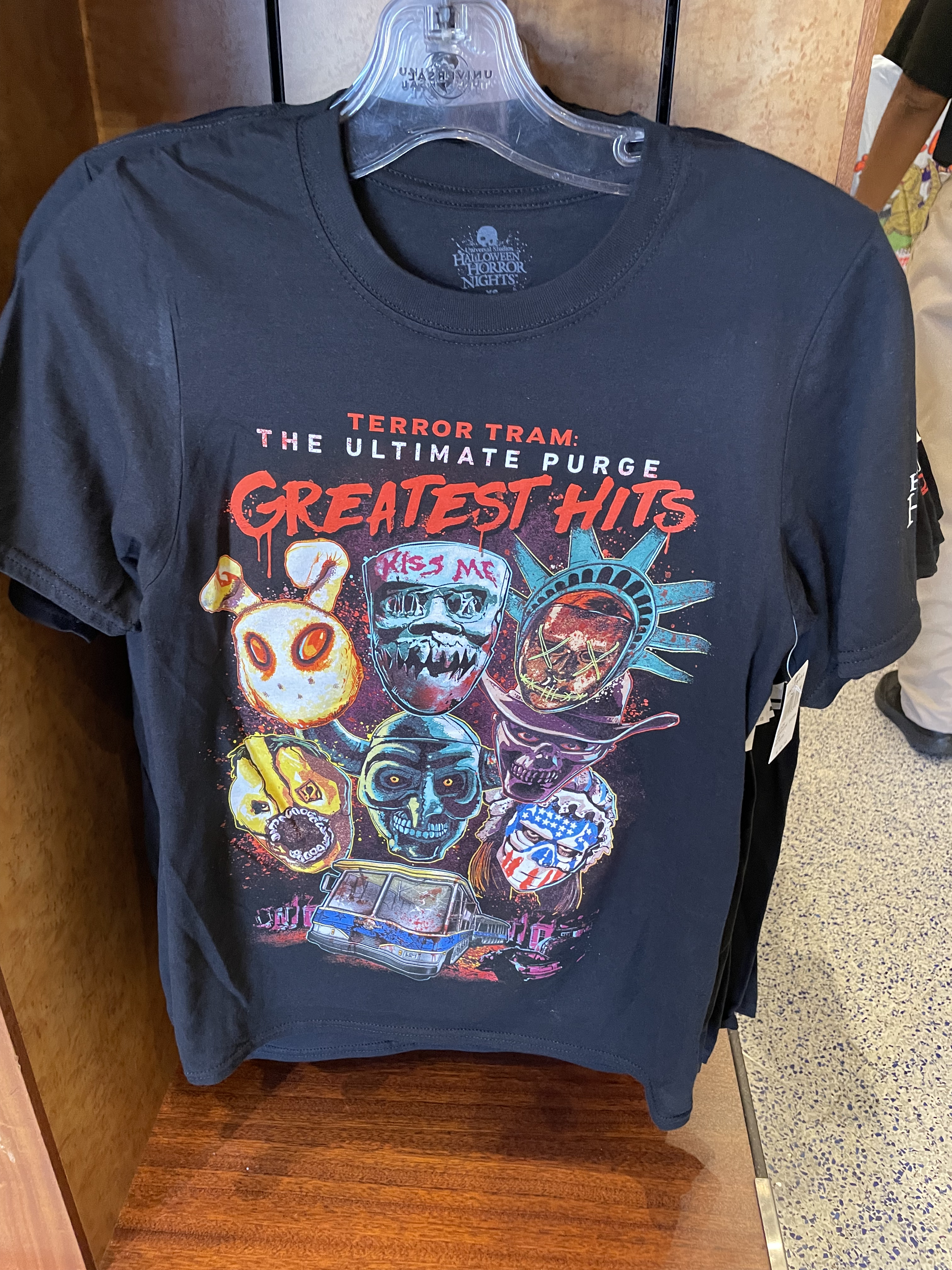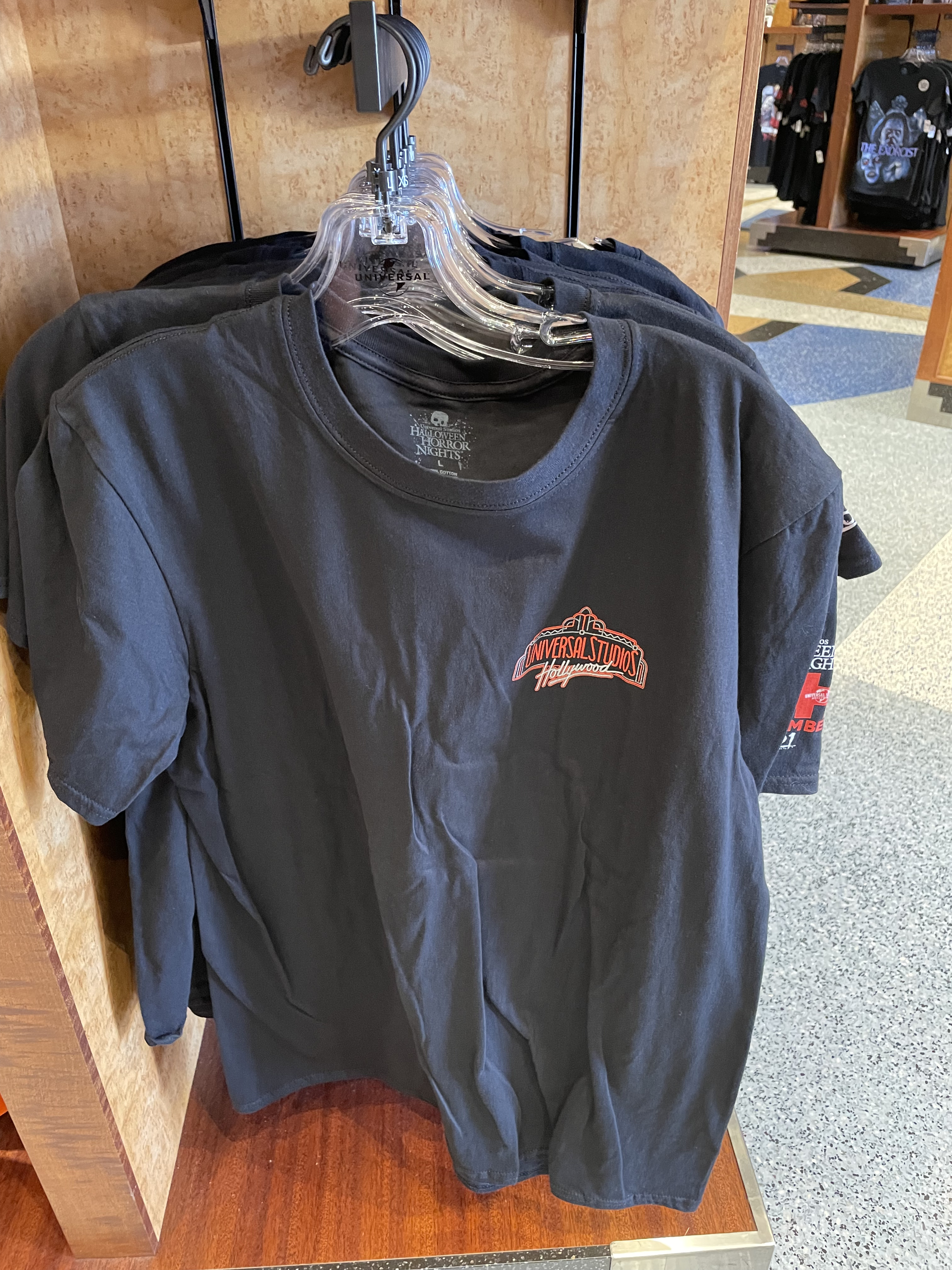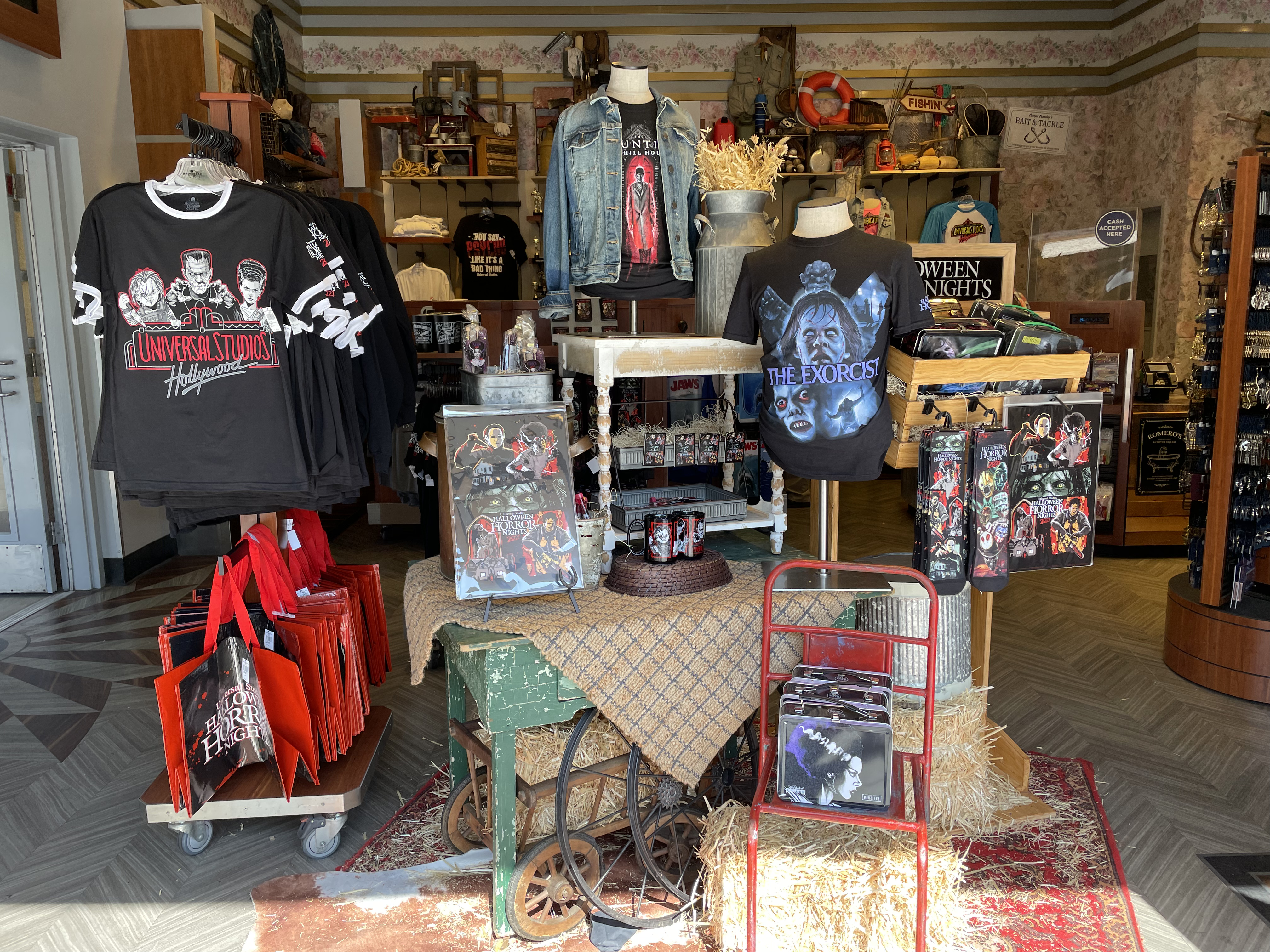 We did notice this year that USH was utilizing the classic Universal Studios Logo a lot and even with its HHN merchandise. We love to see the black, red, and grey version of the logo with some of our favorite characters looming behind. They even released a USH AP shirt for HHN as well! Sadly, they were out of my size when I was attending the event.
