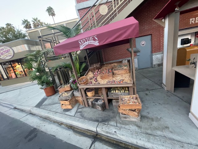 Further down the street, you’ll see structures made out to look like a news stand, fruit stand, and flower stand. They don’t have any “boo holes” in them, which leads me to suspect they might be part of something bigger for the scare zone. Something similar to how they have the funeral procession in Forsaken Lake.