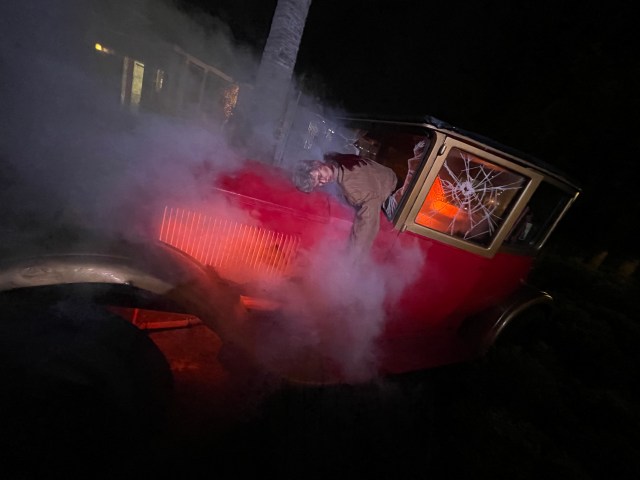 One thing that immediately stood out was the soundscape. Unlike other scare zones where music is really prominent, the soundscape here is more subtle. It reminded us the music played in the Tower of Terror lobby. Slow, soft and ethereal. It’s really quiet haunting. Knott’s also added some large props throughout the zone as well. If you’re entering from the side with Pony Express, you’ll be greeted by a crashed vehicle with smoke erupting from the engine. There is also a very unlucky person who wasn’t wearing their seatbelt during the crash as well.