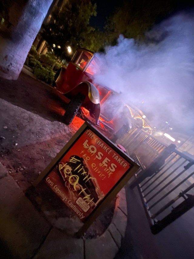 We entered the park after hours when the park was quiet and got our first glimpses of Scary Farm. We walked through the BRAND NEW scarezone for 2021…THE GORE-ING 20’s! Although it didn’t have scare actors/monsters, it did have the music, fog, and props.