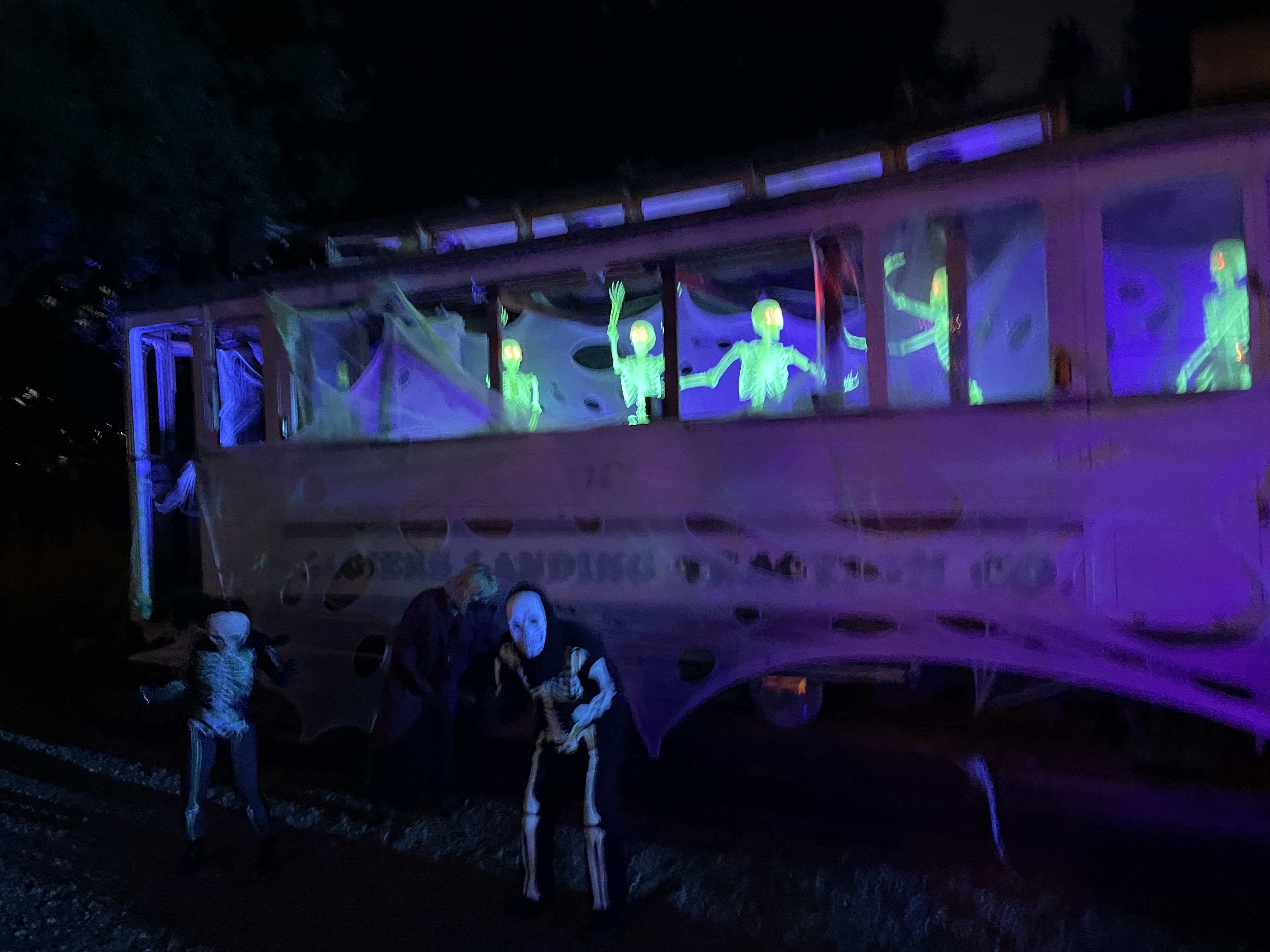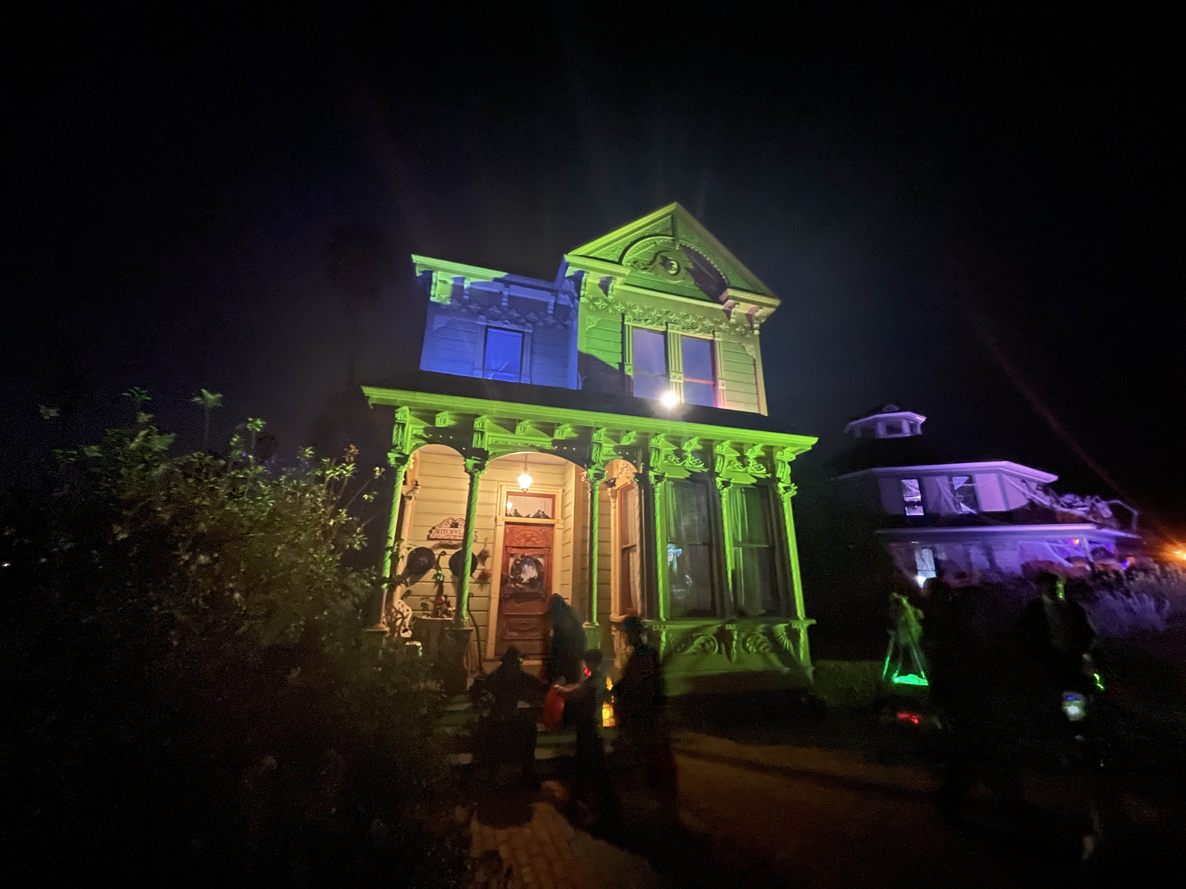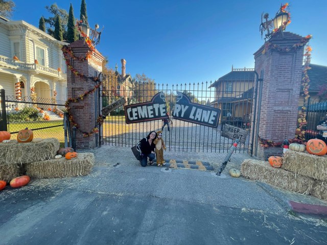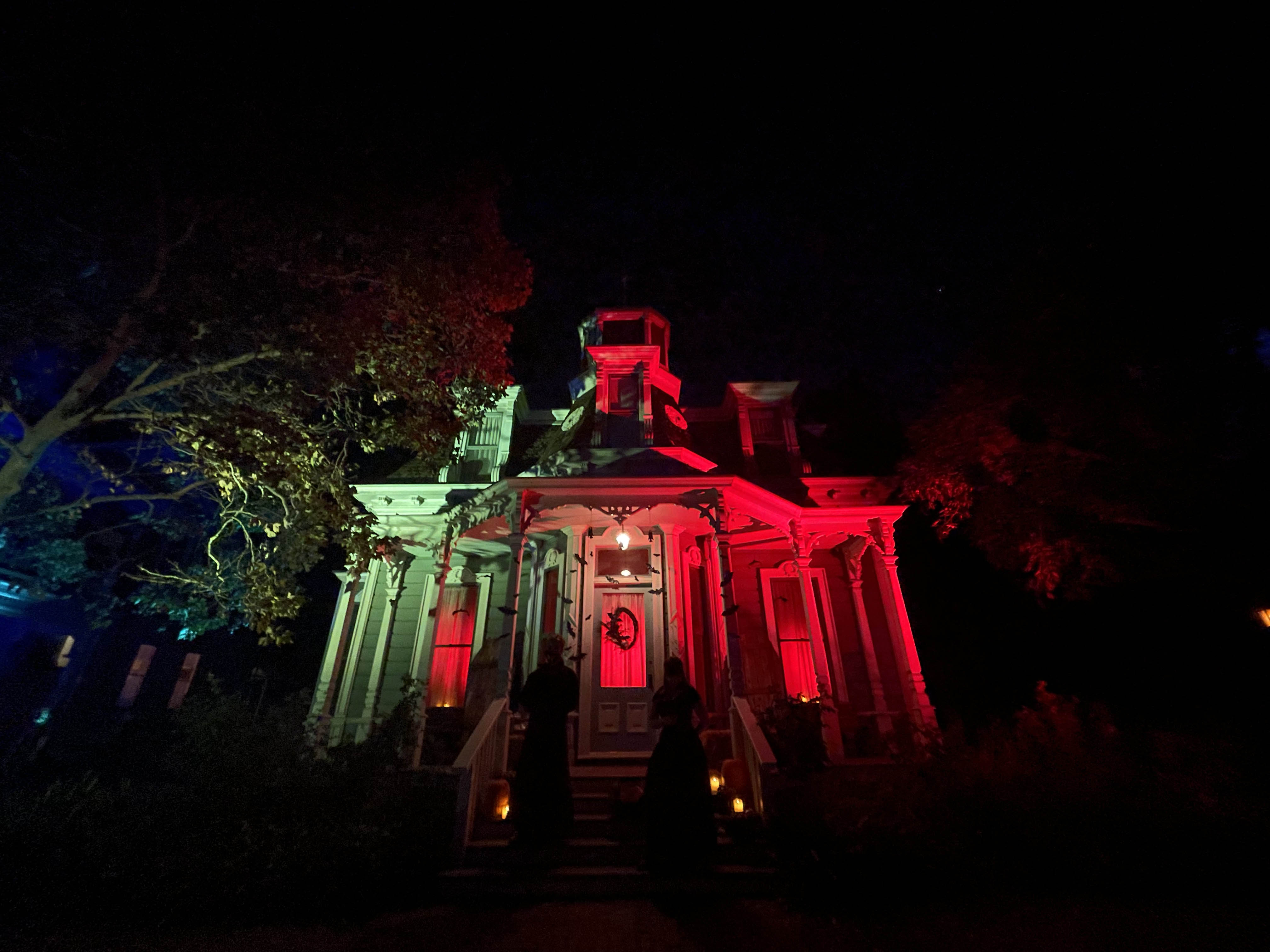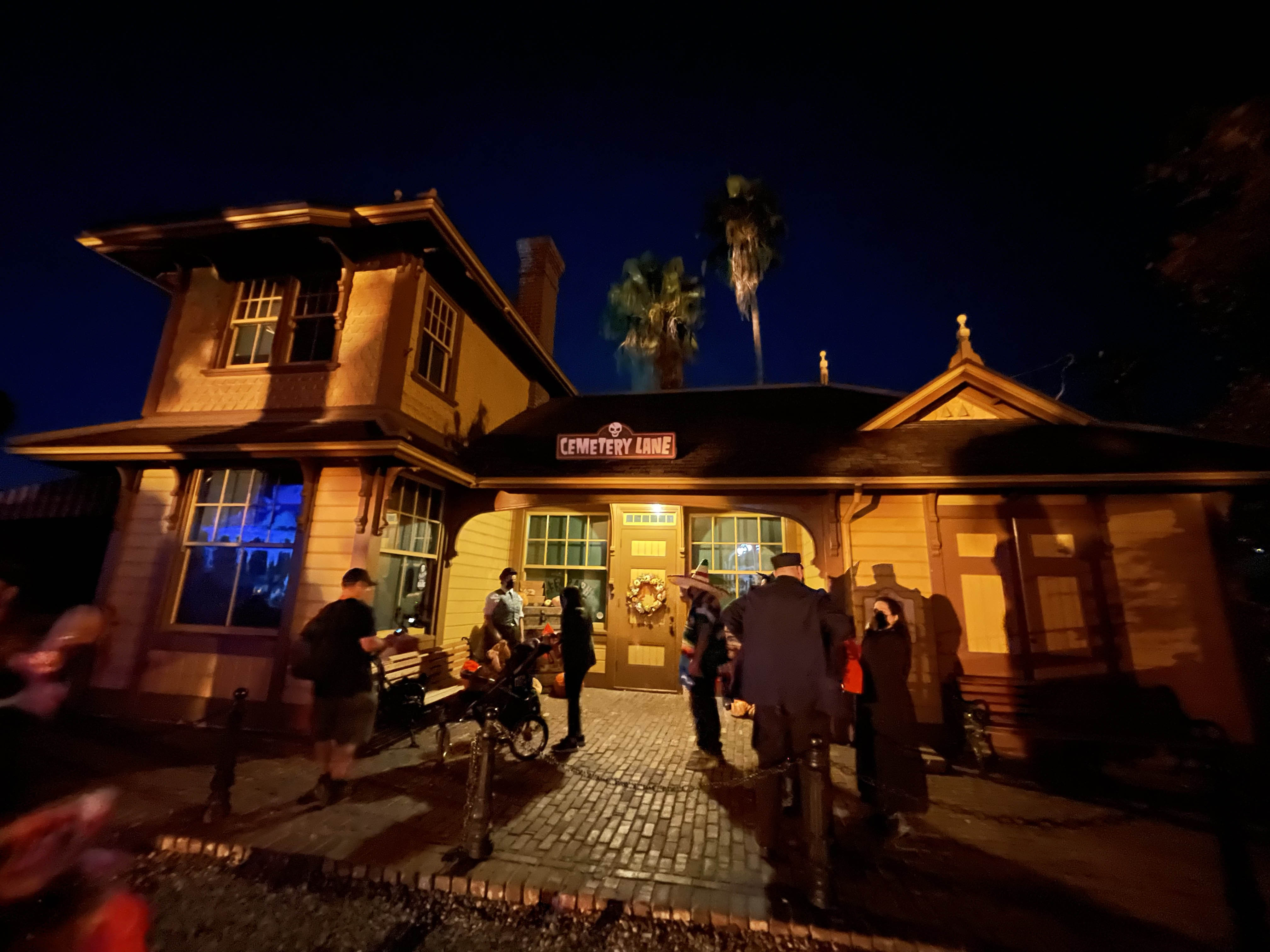 Luckily, we stuck around long enough for the sun to set and we saw Cemetery Lane transform before our eyes. Windows with projections, vibrant lighting on each house, strobe lights, and special effects are everywhere! It really feels completely different at night and we highly suggest checking it out later in the evening. It’s almost like the whole area comes alive once the sun sets. Very appropriate for the Halloween season!