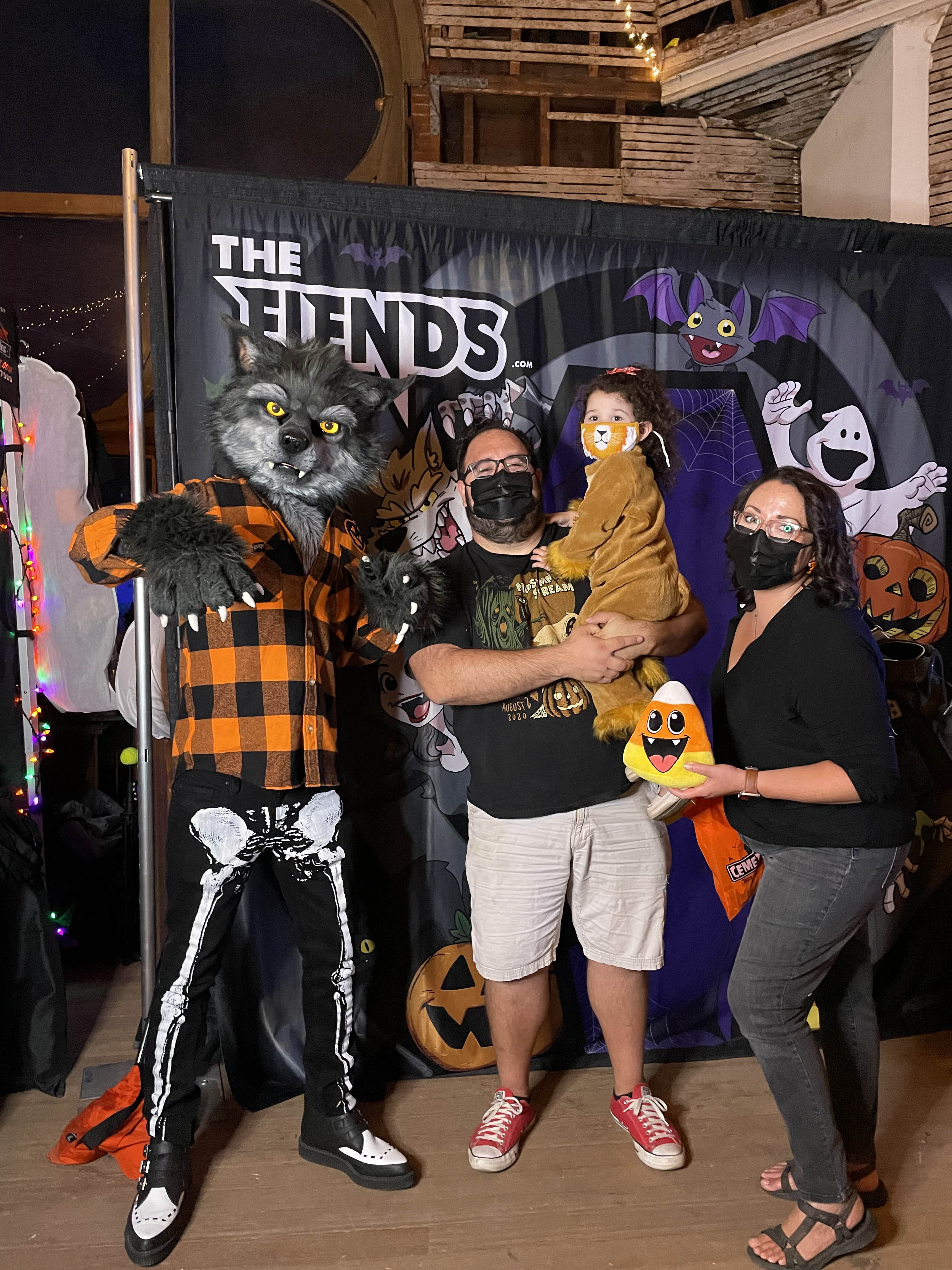 Taking Eireann through the houses started out a bit rough because it was really her first Halloween event…ever. She was extremely hesitant about approaching houses and even characters. But as the sun started to set, she grew accustomed to the area and broke out of her shell. Before we knew it she was dancing with skeletons, took pictures with a vampire, gave high fives to the clowns, and took a pictures with a werewolf. As parents, it made us so happy to see our kid having so much fun with all things spooky. It was the perfect introduction for her to our favorite time of the year.