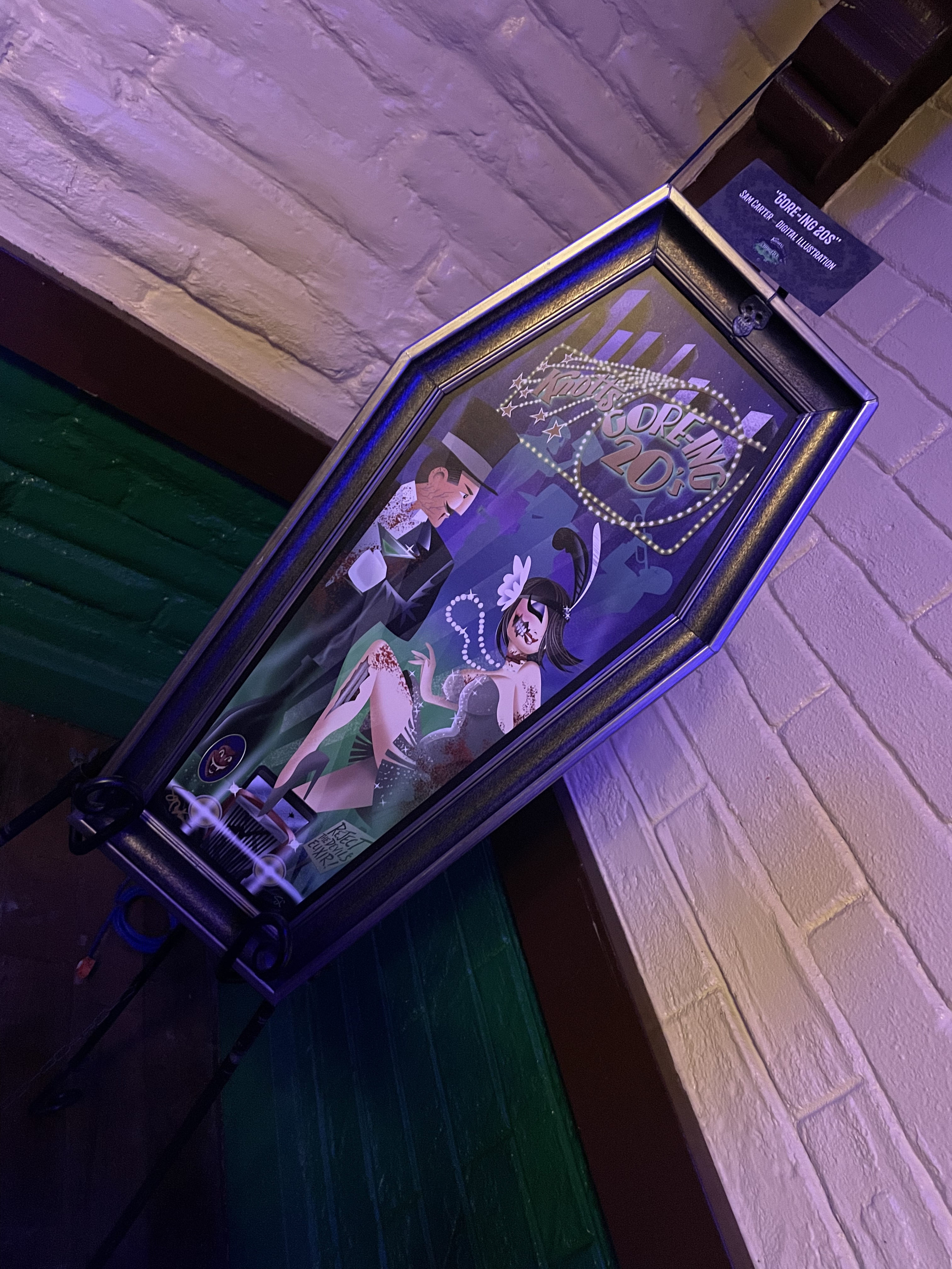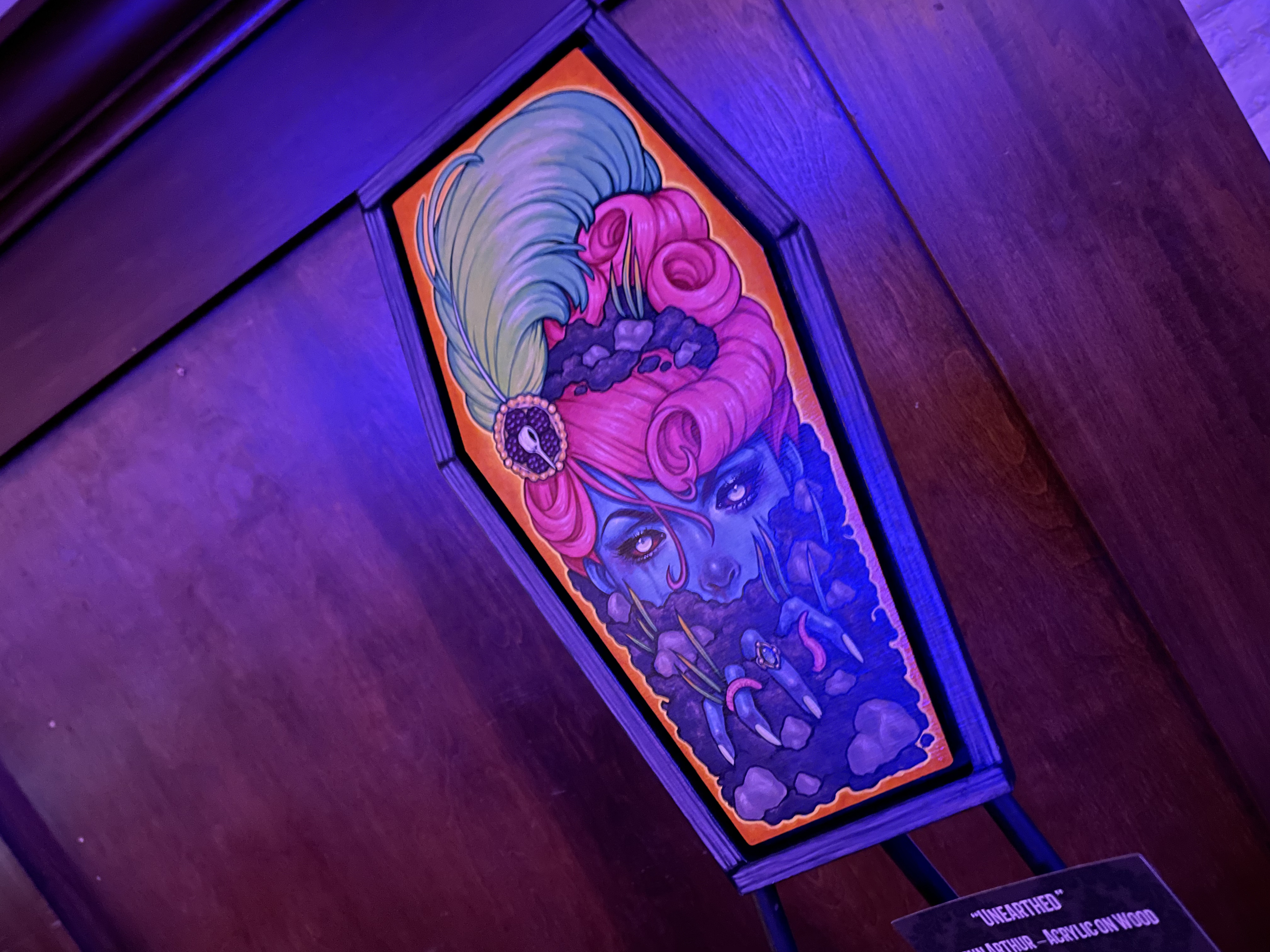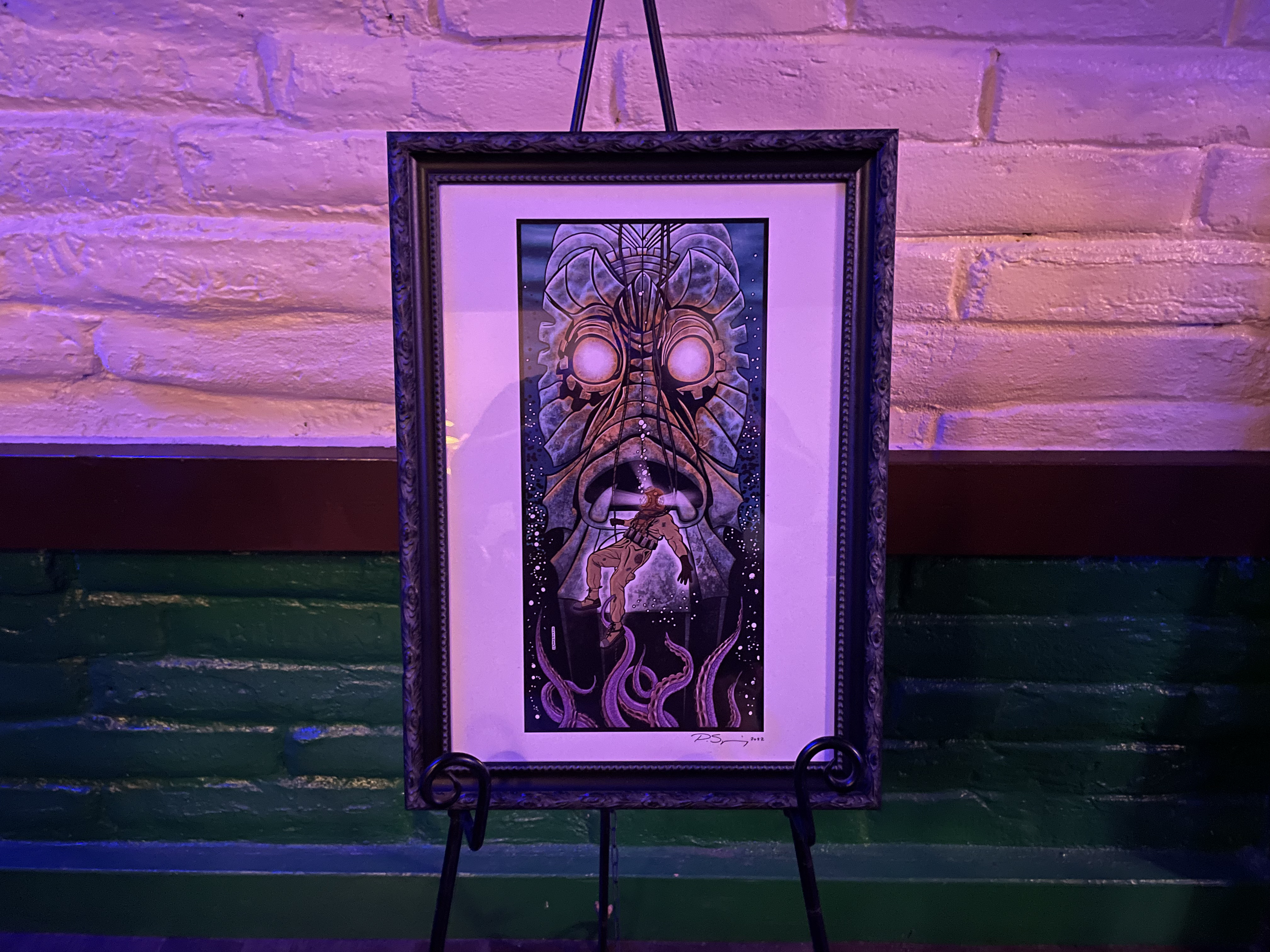 Each piece around the room celebrated a completely different aspect of Knott’s Scary Farm. If you’re a fan of retro Knott’s Scary Farm (Halloween Haunt) they’ve got a piece for you. Or even if you’re into the new mazes and scare zones at Scary Farm, there’s pieces for those as well. Knott’s has cultivated such a fantastic array of styles, mediums and topics for this years show. I cannot wait to buy prints to add to our growing collection of unique Knott’s Scary Farm art.