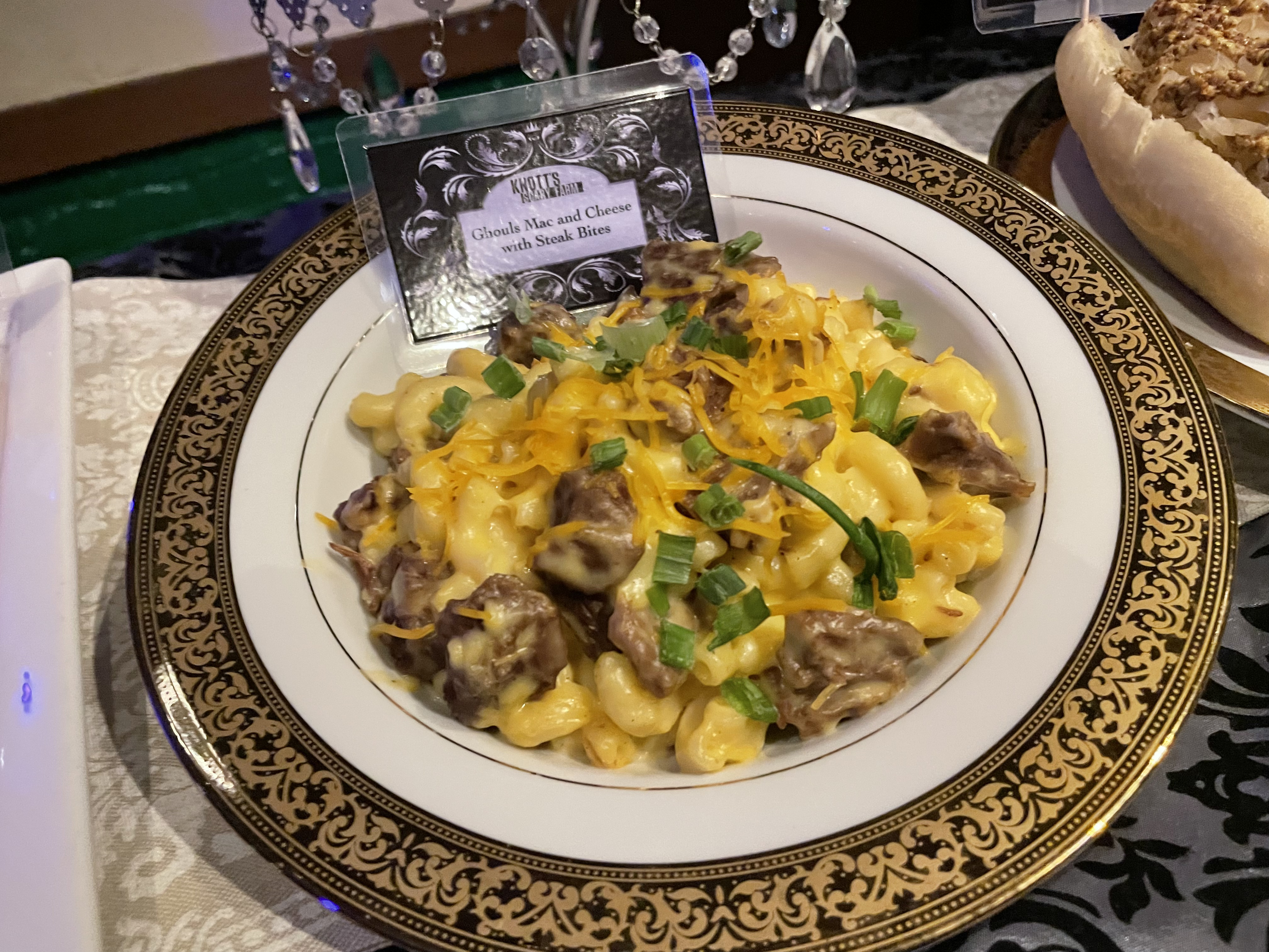 The following dish was a sampler plate of many different items. We tried the Spooky Crabby Sushi Roll, Ghouls Mac and Cheese with Steak Bites, Mexican Chorizo Shrimp Slider and the Creepy Calamari with Spicy Aioli. The winner on this dish by far is the Mac and Cheese. It was extremely flavorful and was very hearty. I was pleasantly surprised by the Spooky Crabby Sushi Roll. I don’t typically order sushi from theme parks, but this really caught me off guard. I really enjoyed the flavors, especially with a small dash of soy sauce. Continuing on the seafood train, the calamari was not chewy at all and was perfectly seasoned. I just wish we could have gotten more sauce for dipping. I can only hope that when served inside the park, guests are given an ample amount of sauce because it’s very tasty. Lastly, we had the Mexican Chorizo Shrimp Slider! This was the only thing on the plate that I didn’t care for. I’m unsure if it’s because my tastebuds were shot from eating so many things or if it truly wasn’t good. But I just didn’t feel like it was nearly as tasty as the previous items we had that night.