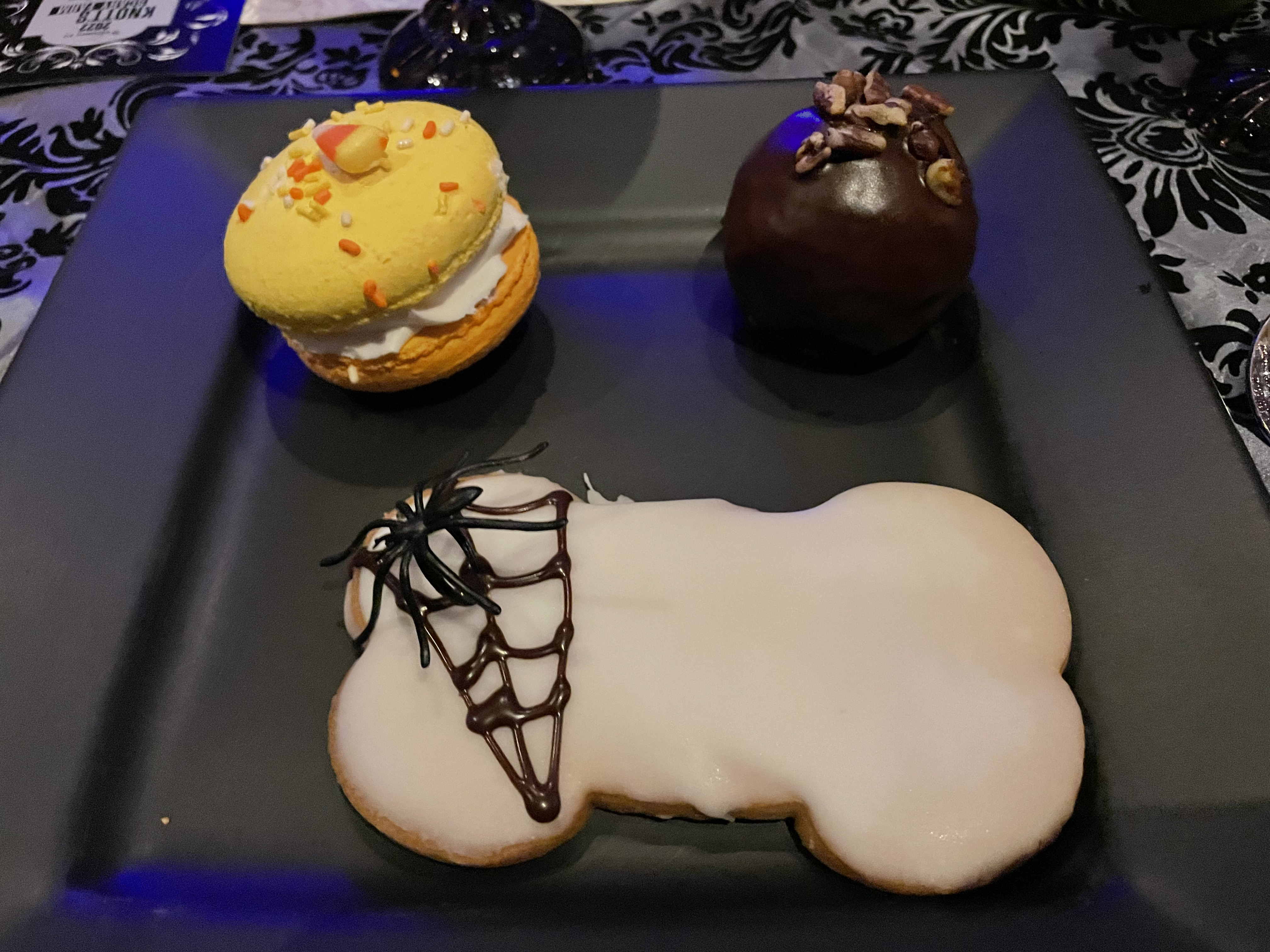 Lastly, we were treated to dessert. We had the Canine Candy Corn, Pecan Pie Brownie Bomb and the Skeleton Bone cookie. The winner by a LONG SHOT on this plate is the brownie bomb. This item was incredibly rich and would be perfect with a warm cup of coffee to cut through the sugar.