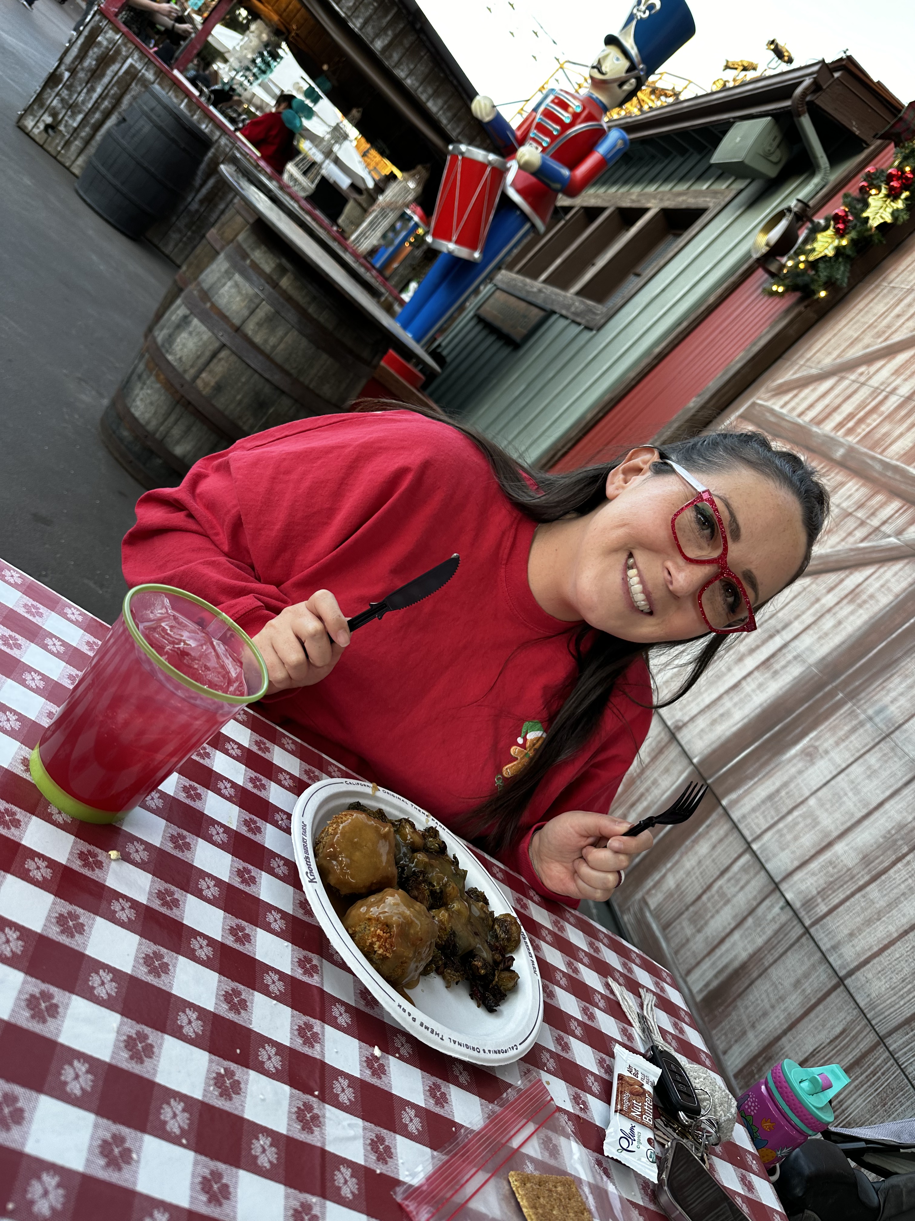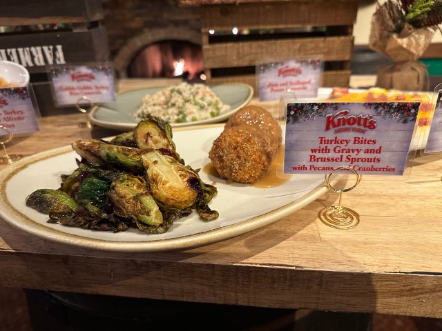 We also got to try some of the seasonal adult beverages and seasonal food items after our photo op with Whittles. While we will dive deeper into the food and drink offerings at the park later in this article, we will share our thoughts on the items we tried. Nikki got the Santa Clausmopolitan ($16) and I got the Breckenridge Christmas Ale ($14). We thoroughly enjoyed both these offerings. The cosmo was well balanced and wasn’t overly sweet and the Ale was the perfect drink for the food we purchased as well. We tried the Turkey Bites with Brussel Sprouts ($12) and the Mistletoe Meatloaf Footlong Hot Dog with Peppers ($14). If you’re visiting Knott’s Merry Farm, the Turkey Bites are a MUST HAVE. This is the food that is most popular at the park during the season and the item we get year after year. The Mistletoe Meatloaf Footlong Hot Dog is new this year and is massive. It’s a hearty serving of food that could be split easily between two people. While there isn’t anything major to write home about in terms of the flavor itself, the item was tasty and filled me up for the rest of the evening…which might have been a problem since there were many more food items I wanted to try. Thank goodness for a season pass!