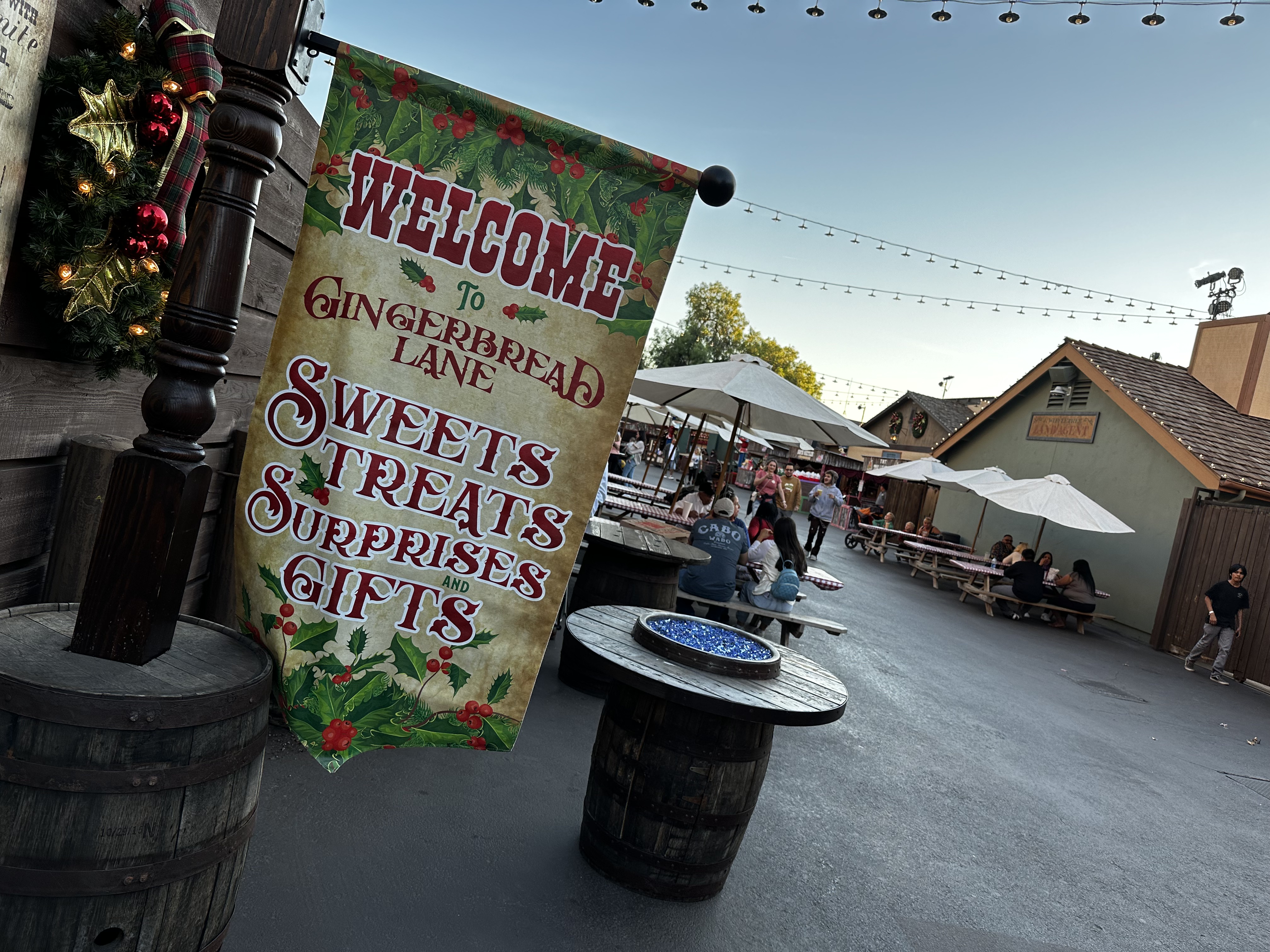 Over past Ghostrider, you’ll find Gingerbread Lane! This cute area has food, drinks, souvenirs, games and photo opportunities. Funny enough, for us personally, we always forget about this area. In the past, this area was mainly used for Scary Farm since many of the mazes are located behind the roller coaster. But they’ve been incorporating this area into many other seasonal celebrations at the park. So make sure not to miss it on your next visit to Merry Farm. We spent a fair amount of time here with our Daughter because she really wanted to meet Whittles again after leaving such a positive impression on her at Spooky Farm. She even asked him where his cobwebs went, which created a very cute interaction between them.