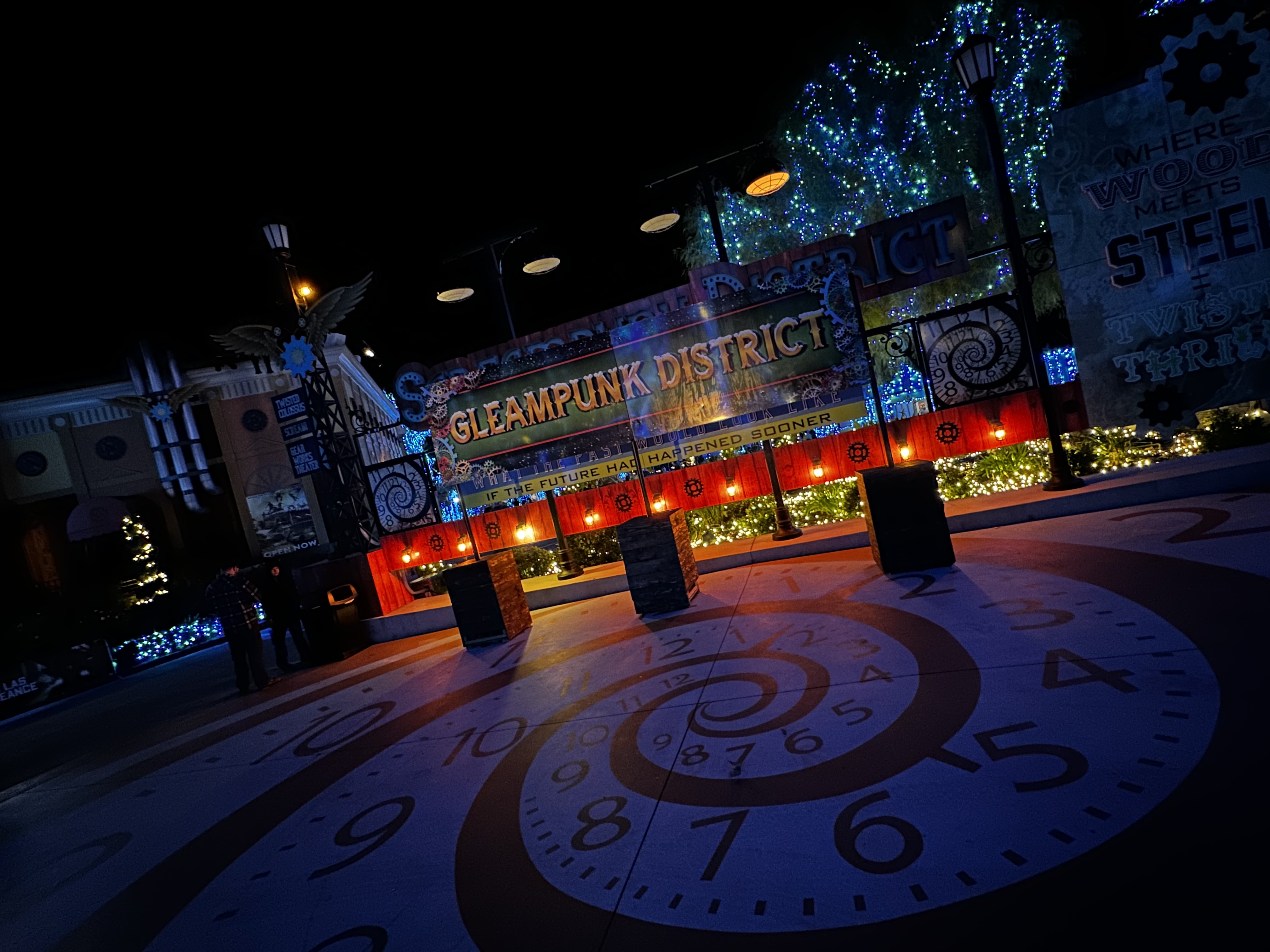 After visiting Santa, we headed on over to the Gleampunk District. This use to be our favorite portion of the park during the holidays because of the kinetic energy and unique decorations. I mean, what other park has steam punk Christmas? This year seemed to be missing multiple elements that somewhat disappointed us. Missing was Santa’s Sleigh, the massive projection on the side of the building, some of the decorations were not working, and there didn’t seem to be any characters in the area. Although one of the characters did seem to be relocated to the North Pole area. It was somewhat sad considering we were so excited to see it again.