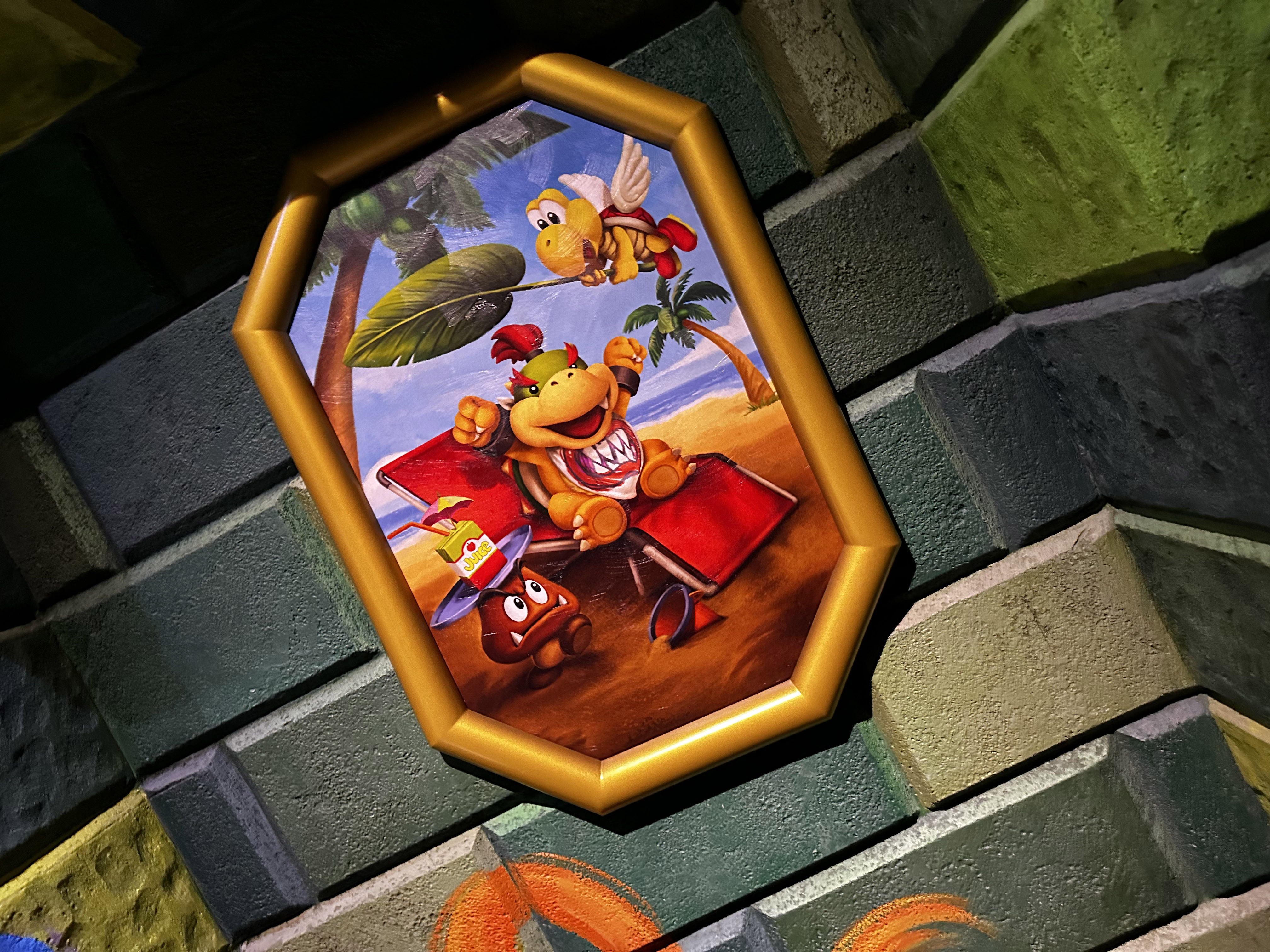 One thing I want to mention is the usage of “lenticular” screens to simulate 3D elements. Throughout the Bowser’s Castle portion of the queue, there are these lenticular screens scattered throughout with different elements on them. Some have first, some have Boo ghosts, some have machines making Mechakoopas and Bob-ombs. It’s a simple yet convincing illusion to simulate depth within an image.