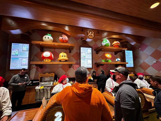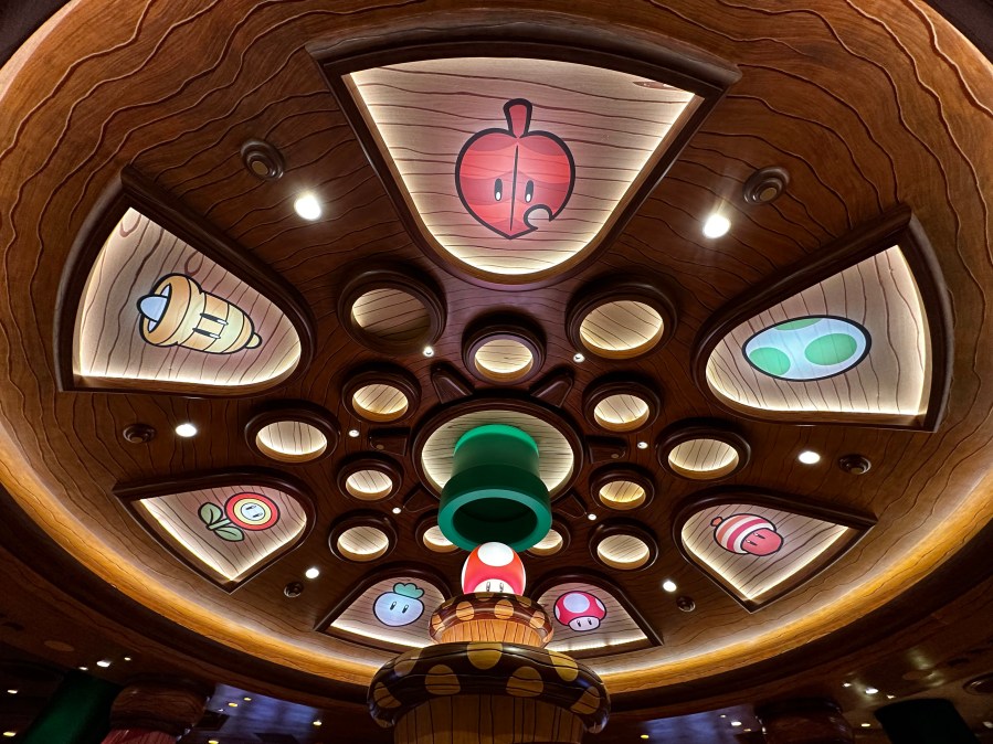 Again, like the rest of the land, there are so many different references to the games that I couldn’t help but smile. The back wall behind the cashiers is lined with recognizable “power ups” from various Mario video games. When I first saw that, my eyes widened and I gasped. But nothing prepared me for the main dining room.