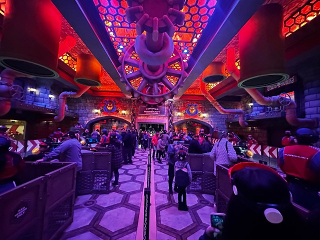 This ground breaking attractions puts guests in the drivers seat of their very own kart to race against Team Bowser (or Team Mario depending on which side you’re on) through recognizable locations from the game. Before we go into more detail on the actual attraction, let’s talk about the queue first.