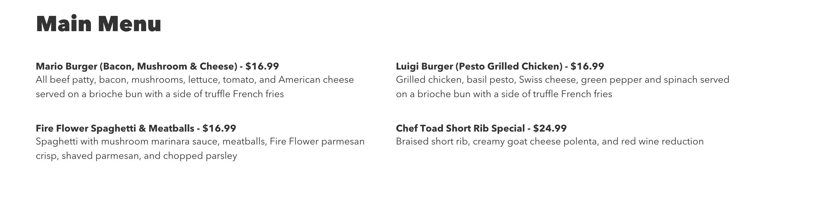 Next up was the Luigi Burger, which is actually a Pesto Grilled Chicken sandwich. First, I’d like to ask why they named it a “burger” when it is not a burger. Honestly, if someone doesn’t read the fine print they might just assume it’s a burger. Never the less, this was hands down the best thing we had! The bun was soft, the chicken was juicy, the pesto sauce was delicious and the ring of bell pepper added a nice fresh crunch to the sandwich. Including the pesto sauce to use as dipping sauce for the truffle fries was the best decision someone made. That person deserves a raise because the sauce was the major highlight and really set off everything on the plate. I’d 100% get this again!