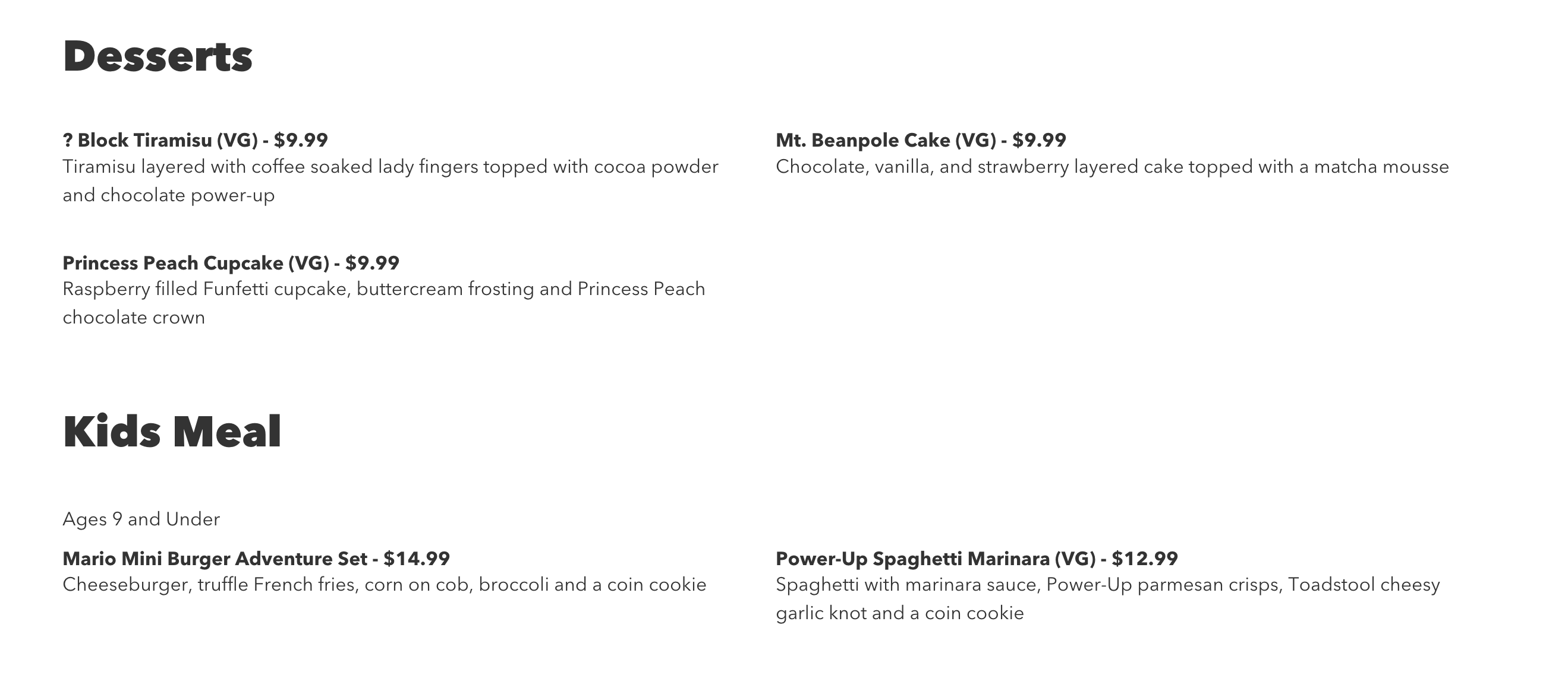 Along the walls of the dining room are screens that act as windows that look outside the restaurant and inside the kitchen as all the chefs cook your meal. Above you on the ceiling are rendings of the same “powers ups” you saw on the way. And in the center sitting atop a green warp pipe is a Mushroom Power Up. Again (I sound like a broken record) the music, while low, is iconic and recognizable music from the games. They even included one of my favorite songs from the games which even brought a tear to my eyes. It’s this one right here: