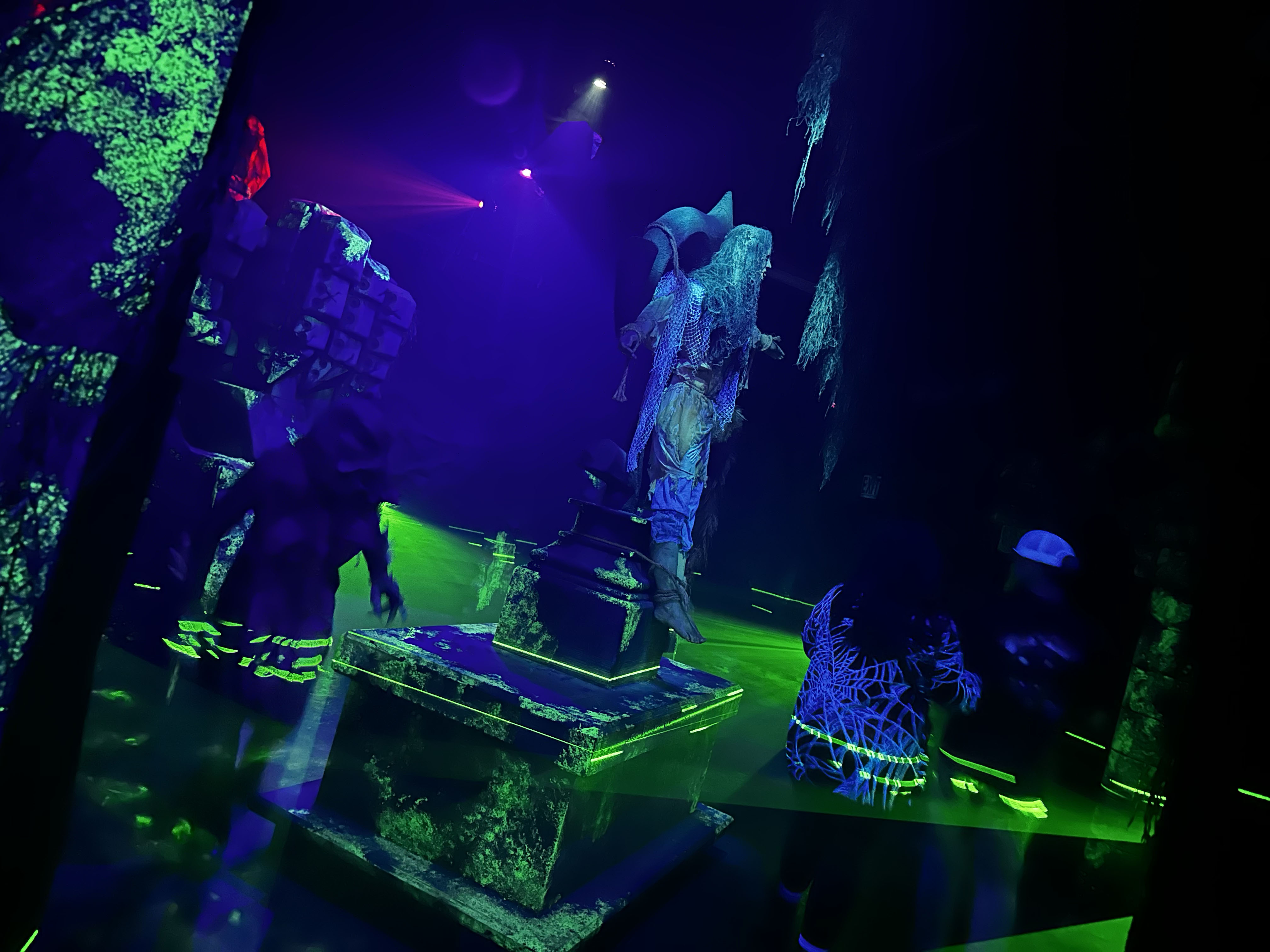 Next up, let’s talk about Dark Entities. This maze, in our opinion, has seen it’s fair share of ups and downs. Undoubtedly gorgeous in it’s lighting and sets, though the scares have always been tepid. We realized very quickly that the maze design itself just didn’t have enough nooks and crannies for monsters to hide in which can really affect how good the scares are during the experience. This can be remedied by a outstandingly energetic cast, but expecting every monster to be at peak energy seems out of the question.