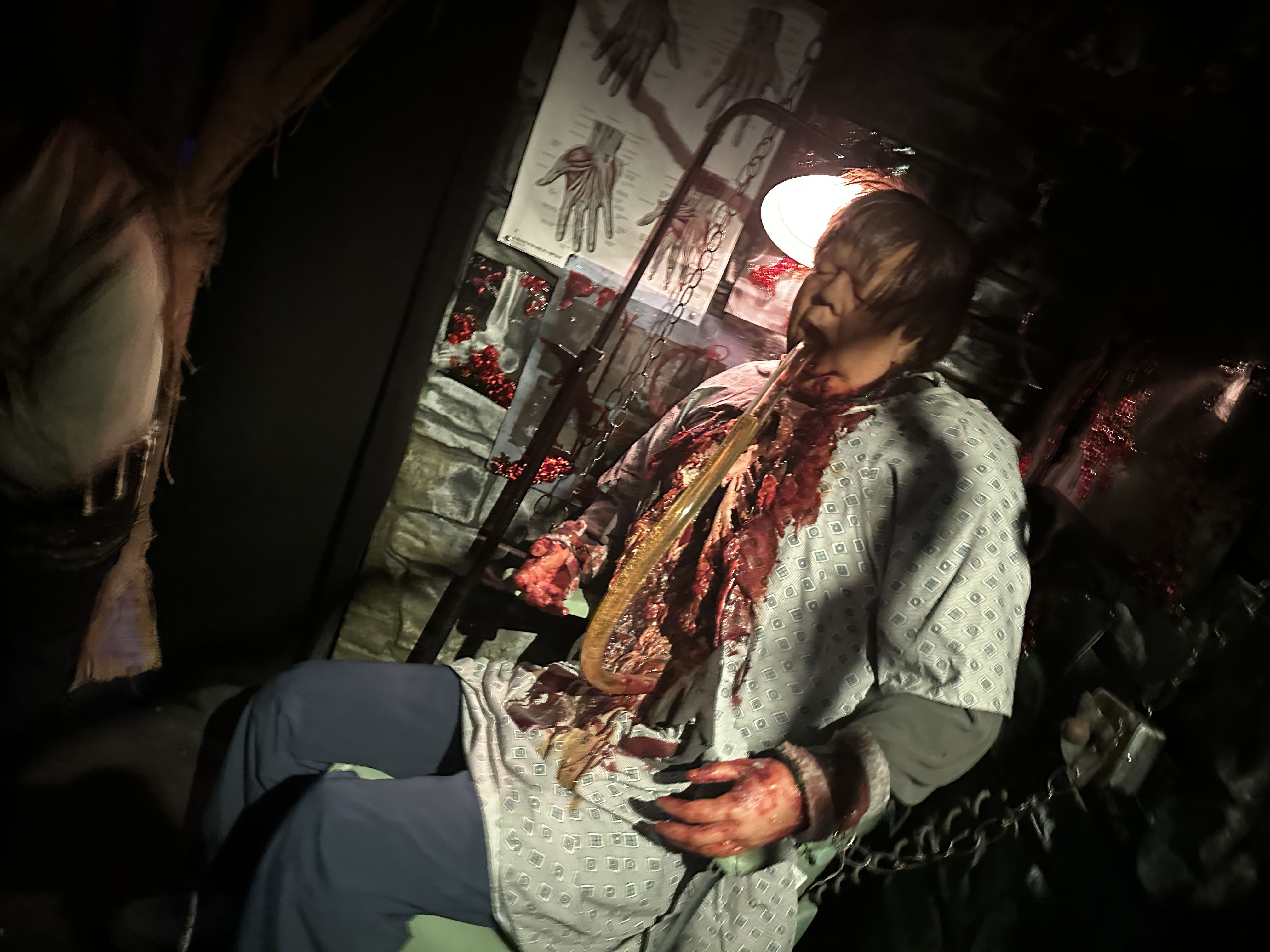 It felt as though each room we entered, I was in awe of the sets. Whether they were small or large scale, each one was so detailed and impressive. From the Camp Gonnagetcha scene with a large scale boat, to the Slaughterhouse room with moving circular saws, and the Sorority Party house; each one impressive for different reasons. The maze also feels so long! It’s rather shocking that this maze feels tremendously longer than Dark Ride yet resides in the same footprint.