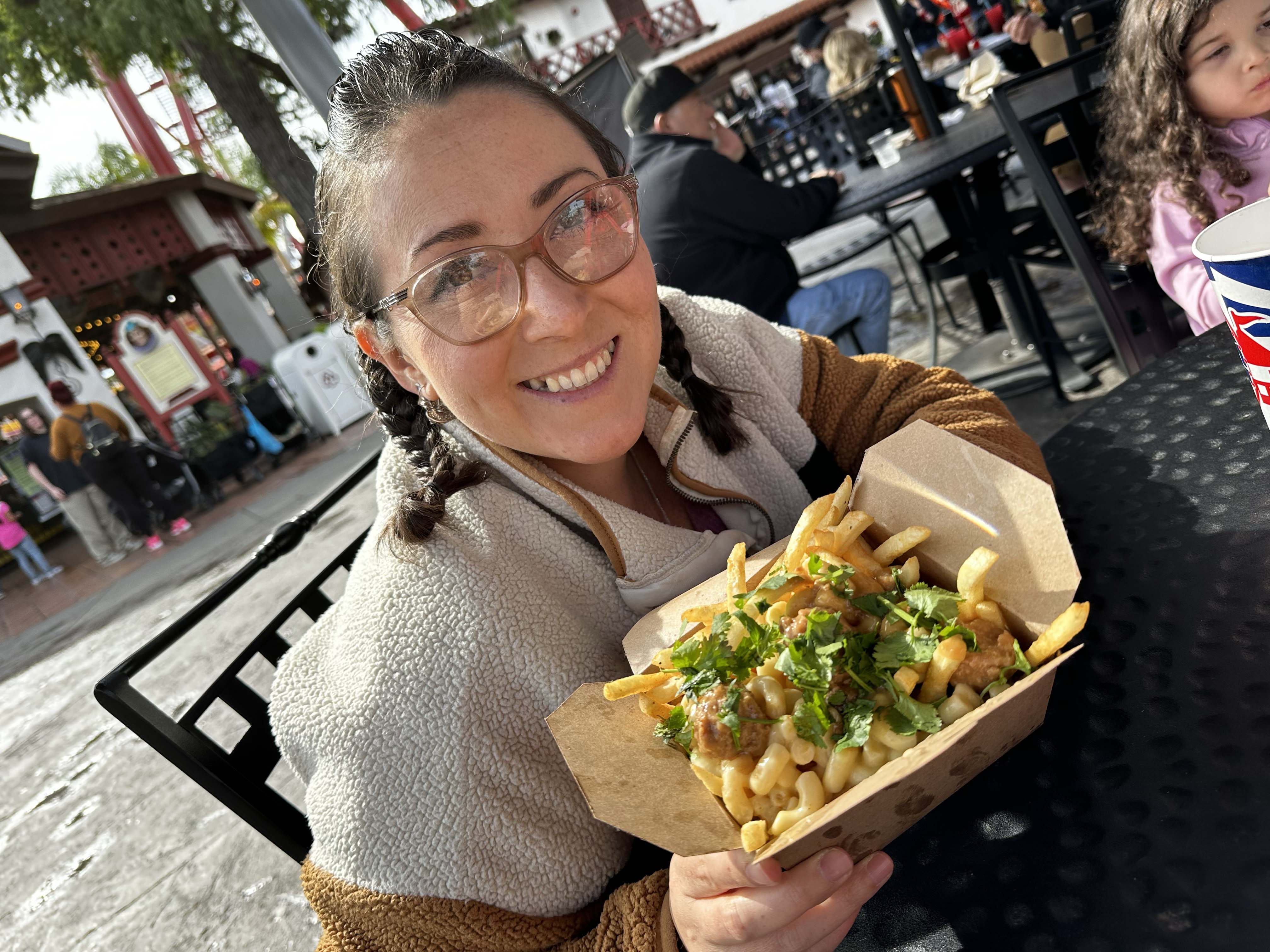 After perhaps one too many rides on Lucy’s Tugboat, it was time to leave Camp Snoopy in search of some grub. We really had our hearts set on trying the Schroeders Fluffy Breakfast Mac and Cheese Pancakes, but the line at Sutter’s Grill was just too long for our hungry tummies. Not really sure why it was so long, maybe others had the same idea! Hopefully operations can smooth out these small issues. We, instead, made our way over to Papas Mexicanas and grabbed Jose Peterson’s Swedish Meatball on Top of Mac and Cheese and French Fries. This turned out to be a satisfying snack! Although we do suggest opting for the Waffle Fries as the base to add a bit of crunch to the dish.
