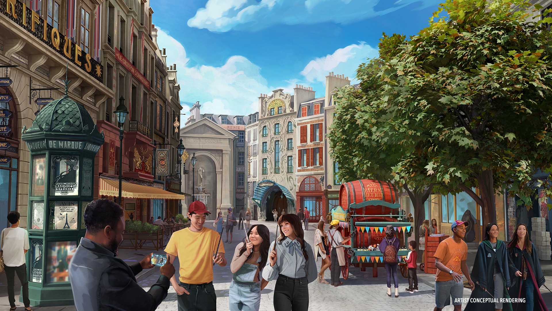 Beyond the world’s ornate portal, guests will first journey from a Muggle park in Paris into the breathtaking spectacle of 1920’s Place Cachée – a hidden, bustling shopping district in wizarding Paris lined with Haussmannian buildings, shops, sidewalk cafés, and historic Parisian domes rising in the distance. Here, wizards and non-magiques alike will be enamored with the majestic grandeur and enchanting ambiance of the city as they cast dazzling spells throughout the magical streets using interactive wands, encounter fantastic beasts at a traveling circus, and – for the first time ever within The Wizarding World of Harry Potter – travel across countries and time to 1990s London using the Métro-Floo for a thrilling adventure set inside the iconic British Ministry of Magic.