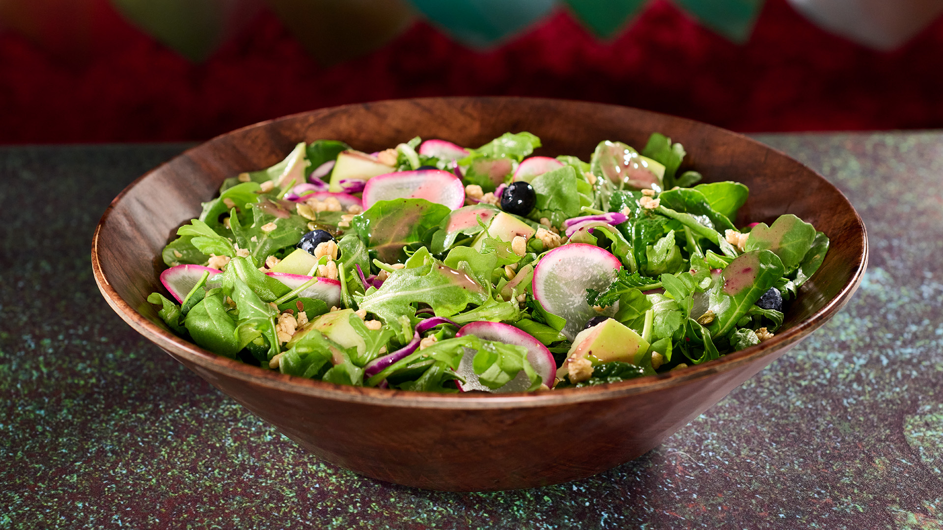- Nordic Harvest Salad (VG)(Mead Hall) –this salad features kale and arugula greens, crisp red cabbage, radishes and hearty ancient grains, with blueberries and crisp apples for a tangy flavor, a sprinkle of trail mix that adds a satisfying crunch and raspberry vinaigrette to top it all off
