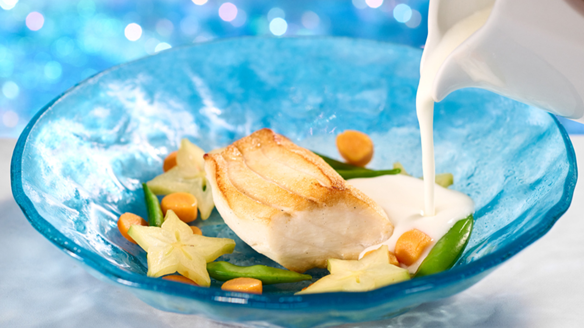 - Sea Bass (Atlantic) –a delectable portion of Sea Bass nestled amid the subtle sweetness of carrot mochi and vibrant crunch of fresh sugar snap peas. Aromatic lemongrass broth complements the buttery bass, while starfruit slices add a splash of tropical citrus notes