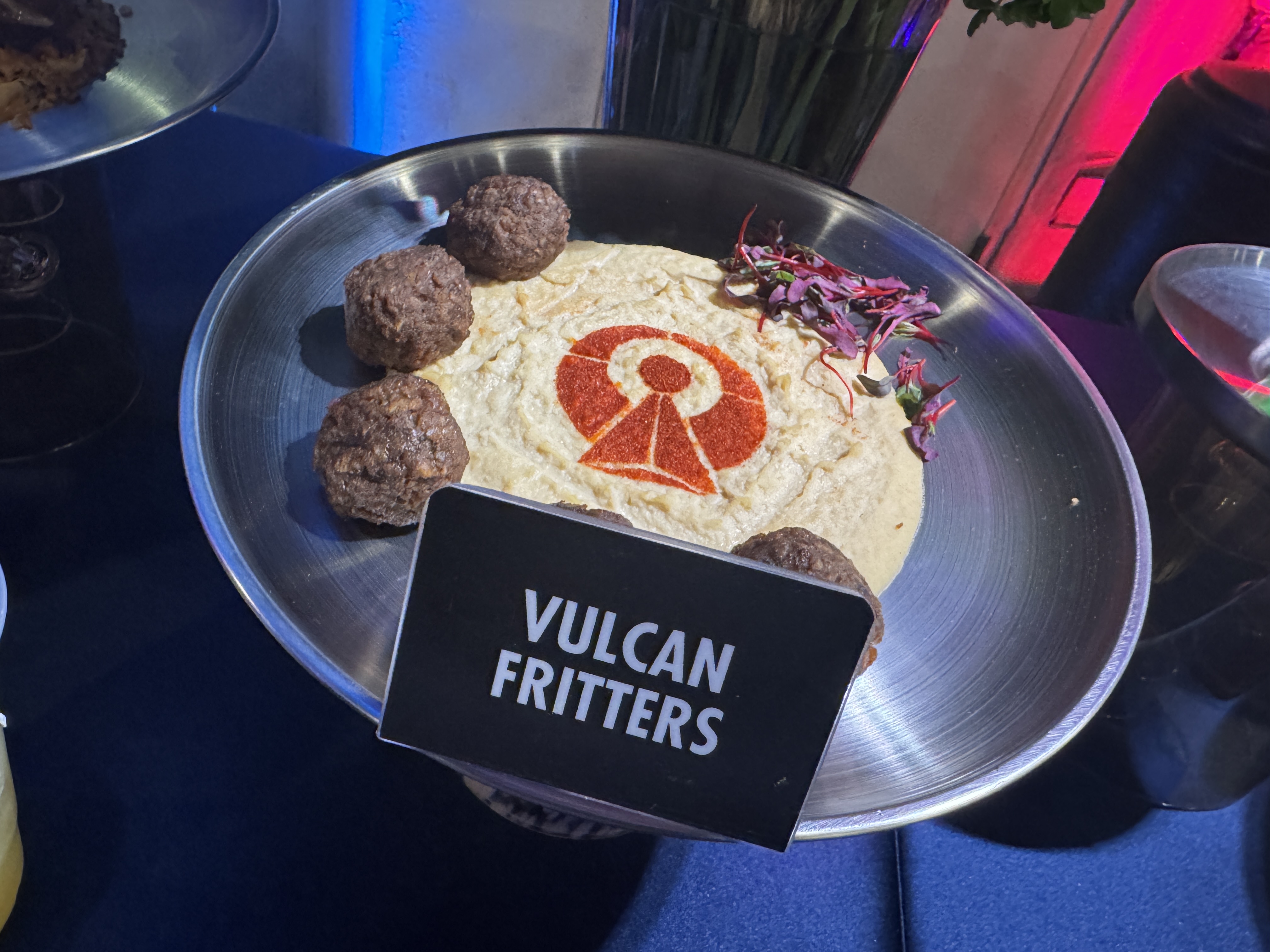VULCAN FRITTERS 6/10 – Fried mushroom fritters served with hummus and dusted with a Redspice Vulcan logo.