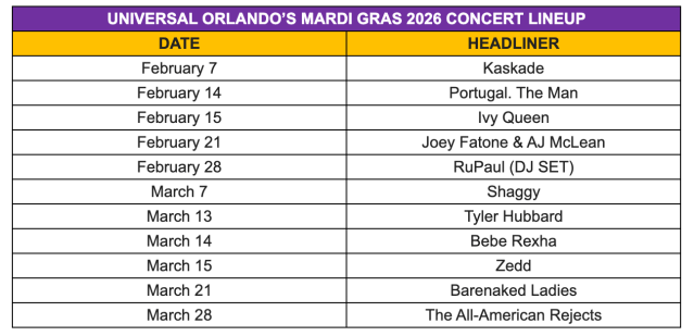 STAR-STUDDED CONCERT LINEUP FOR UNIVERSAL ORLANDO’S MARDI GRAS 2026