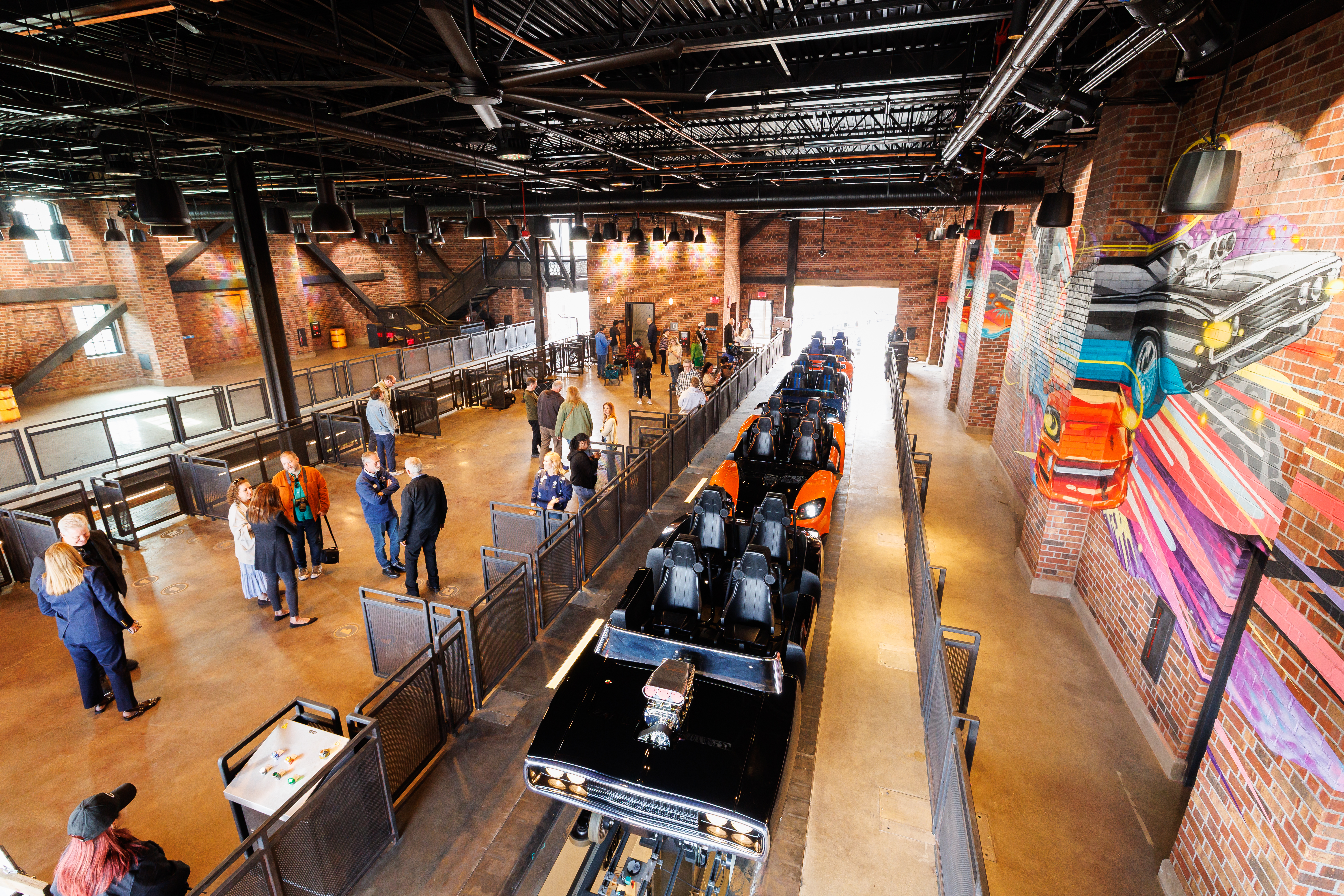 “Fast & Furious: Hollywood Drift” will be located on the Upper Lot of Universal Studios Hollywood and is modeled after an expansive red brick, garage-like structure. It will feature groundbreaking 360-degree rotation technology designed to create a seamless sensation of drifting cars as guests spin in motion at speeds up to 72 mph, while careening along 4,100 feet of elaborate aerial track—the equivalent of nearly 12 football fields—that winds its way over sections of the theme park, including the multi-level Starway escalator that connects the Upper and Lower Lots.